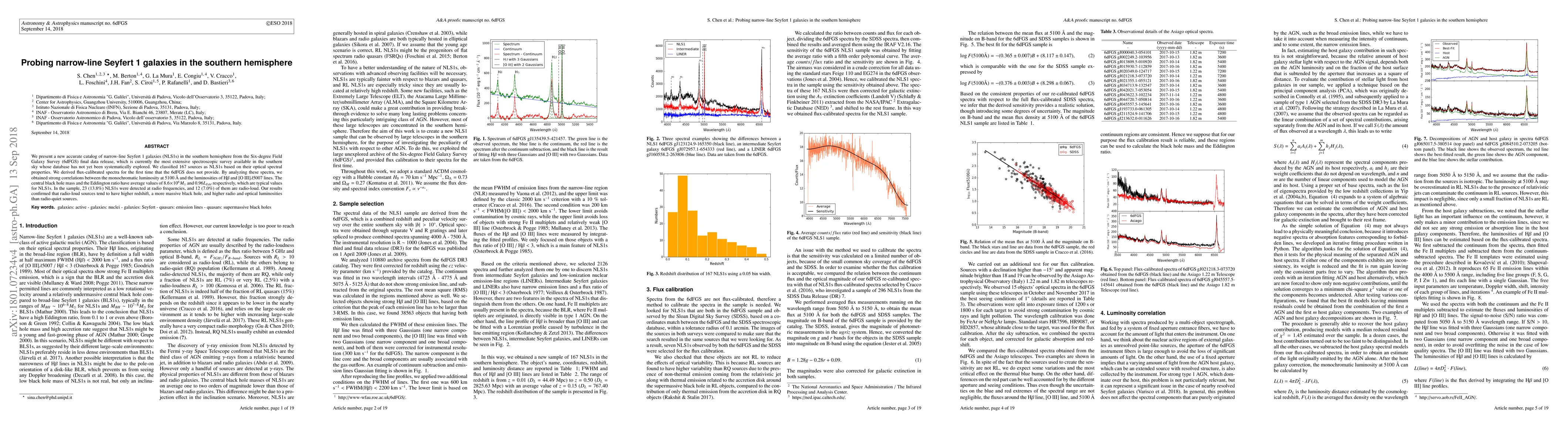 This study catalogs 167 narrow-line Seyfert 1 galaxies (NLS1s) in the southern hemisphere from the 6dFGS, providing flux-calibrated spectra for the first time. The analysis reveals typical NLS1 characteristics, including a central black hole mass of 8.6 x 10^6 M_Sun and an Eddington ratio of 0.96 L_Edd, with radio-loud NLS1s showing higher redshifts and luminosities.
