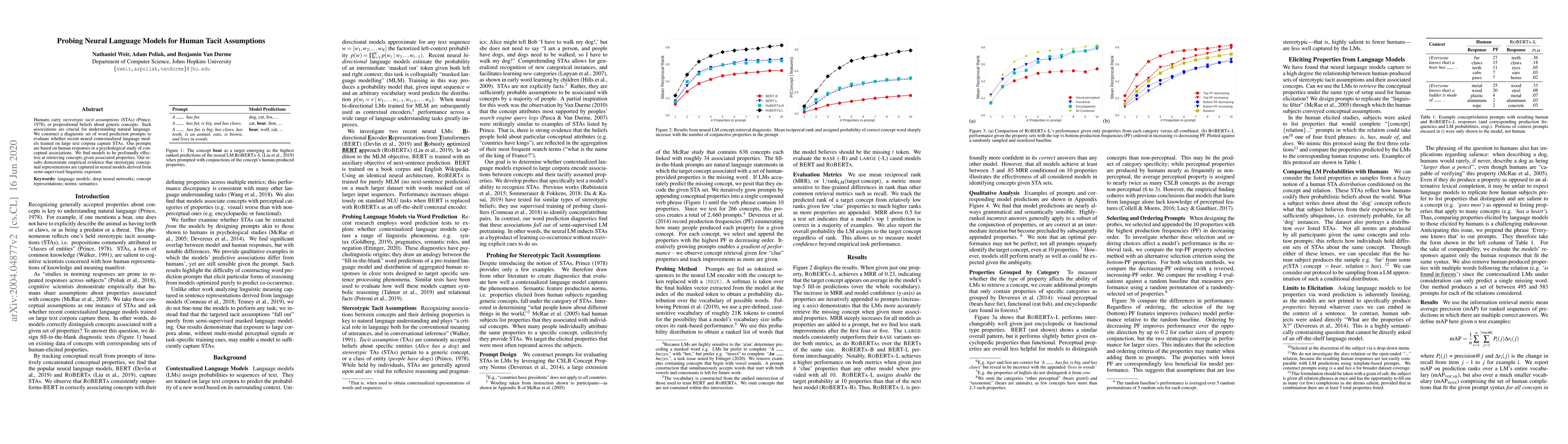 Humans carry stereotypic tacit assumptions (STAs) (Prince, 1978), or propositional beliefs about generic concepts. Such associations are crucial for understanding natural language. We construct a diagnostic set of word prediction prompts to evaluate whether recent neural contextualized language models trained on large text corpora capture STAs. Our prompts are based on human responses in a psychological study of conceptual associations. We find models to be profoundly effective at retrieving concepts given associated properties. Our results demonstrate empirical evidence that stereotypic conceptual representations are captured in neural models derived from semi-supervised linguistic exposure.