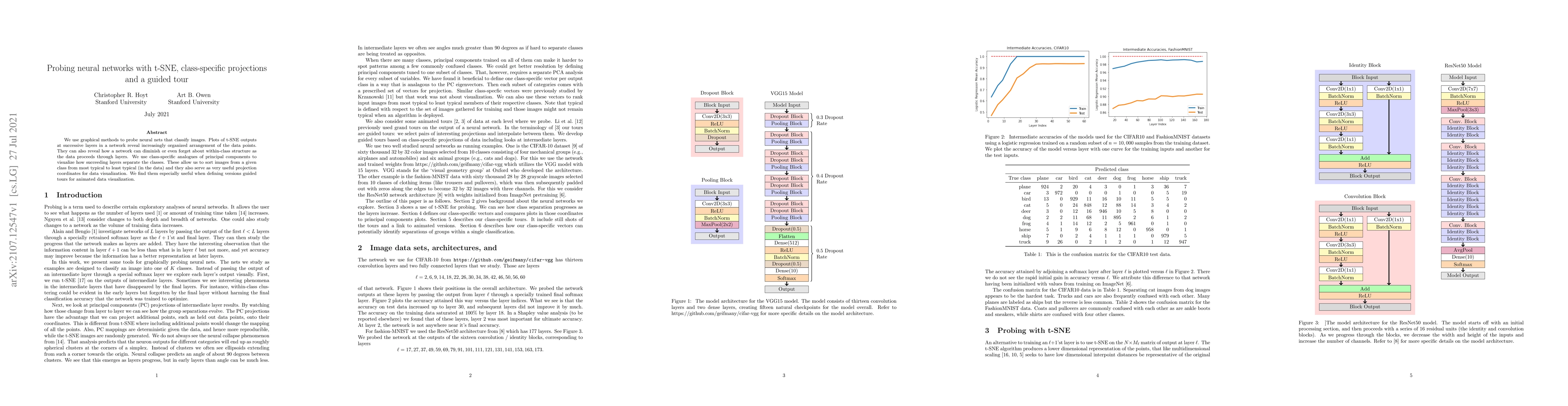 We use graphical methods to probe neural nets that classify images. Plots of t-SNE outputs at successive layers in a network reveal increasingly organized arrangement of the data points. They can also reveal how a network can diminish or even forget about within-class structure as the data proceeds through layers. We use class-specific analogues of principal components to visualize how succeeding layers separate the classes. These allow us to sort images from a given class from most typical to least typical (in the data) and they also serve as very useful projection coordinates for data visualization. We find them especially useful when defining versions guided tours for animated data visualization.