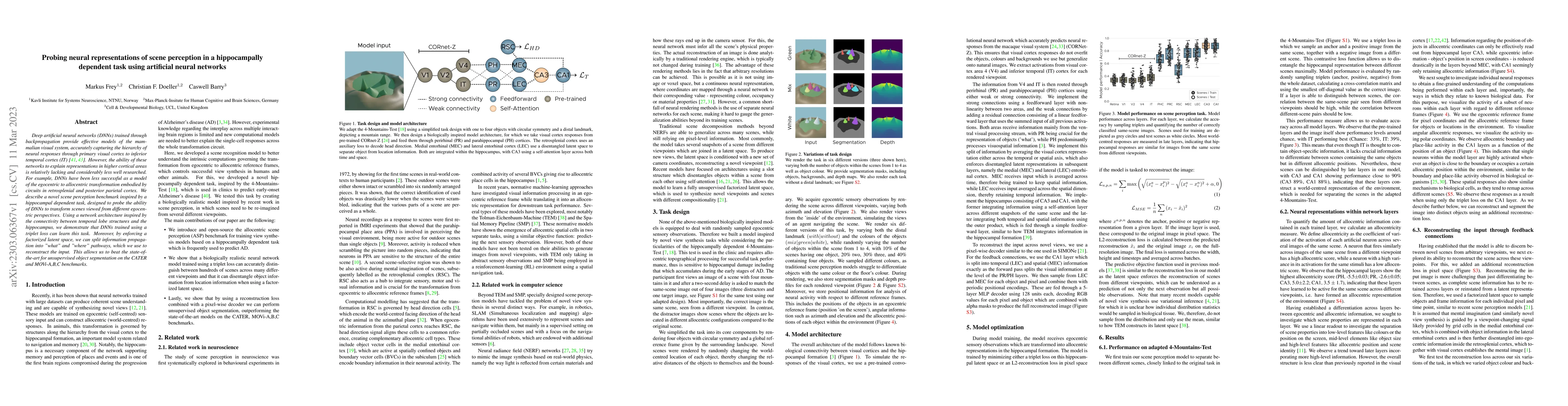 Deep artificial neural networks (DNNs) trained through backpropagation provide effective models of the mammalian visual system, accurately capturing the hierarchy of neural responses through primary visual cortex to inferior temporal cortex (IT). However, the ability of these networks to explain representations in higher cortical areas is relatively lacking and considerably less well researched. For example, DNNs have been less successful as a model of the egocentric to allocentric transformation embodied by circuits in retrosplenial and posterior parietal cortex. We describe a novel scene perception benchmark inspired by a hippocampal dependent task, designed to probe the ability of DNNs to transform scenes viewed from different egocentric perspectives. Using a network architecture inspired by the connectivity between temporal lobe structures and the hippocampus, we demonstrate that DNNs trained using a triplet loss can learn this task. Moreover, by enforcing a factorized latent space, we can split information propagation into "what" and "where" pathways, which we use to reconstruct the input. This allows us to beat the state-of-the-art for unsupervised object segmentation on the CATER and MOVi-A,B,C benchmarks.