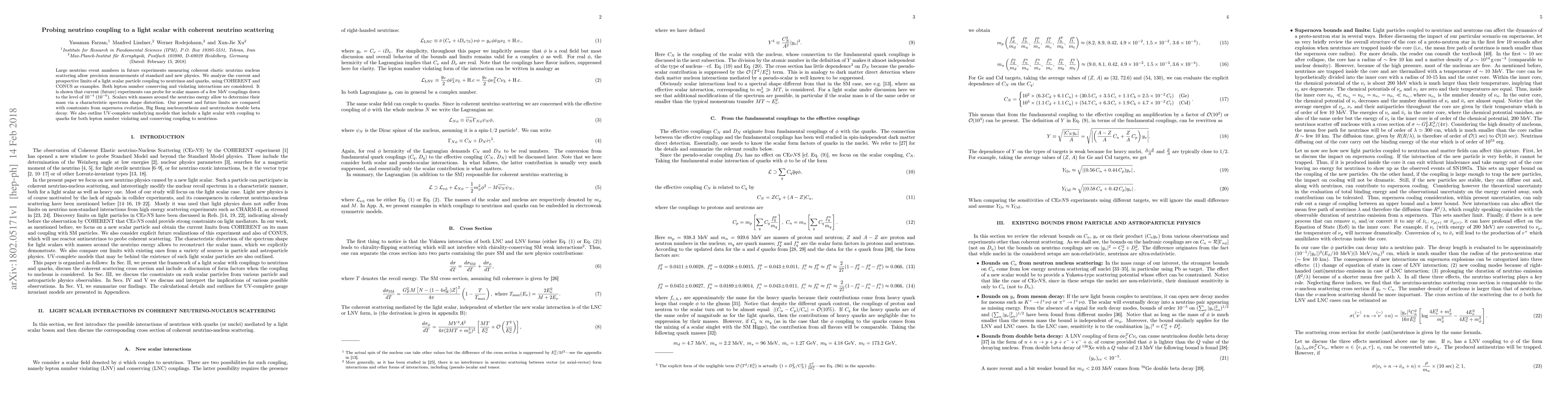 Large neutrino event numbers in future experiments measuring coherent elastic neutrino nucleus scattering allow precision measurements of standard and new physics. We analyze the current and prospective limits of a light scalar particle coupling to neutrinos and quarks, using COHERENT and CONUS as examples. Both lepton number conserving and violating interactions are considered. It is shown that current (future) experiments can probe for scalar masses of a few MeV couplings down to the level of $10^{-4}$ $(10^{-6})$. Scalars with masses around the neutrino energy allow to determine their mass via a characteristic spectrum shape distortion. Our present and future limits are compared with constraints from supernova evolution, Big Bang nucleosynthesis and neutrinoless double beta decay. We also outline UV-complete underlying models that include a light scalar with coupling to quarks for both lepton number violating and conserving coupling to neutrinos.