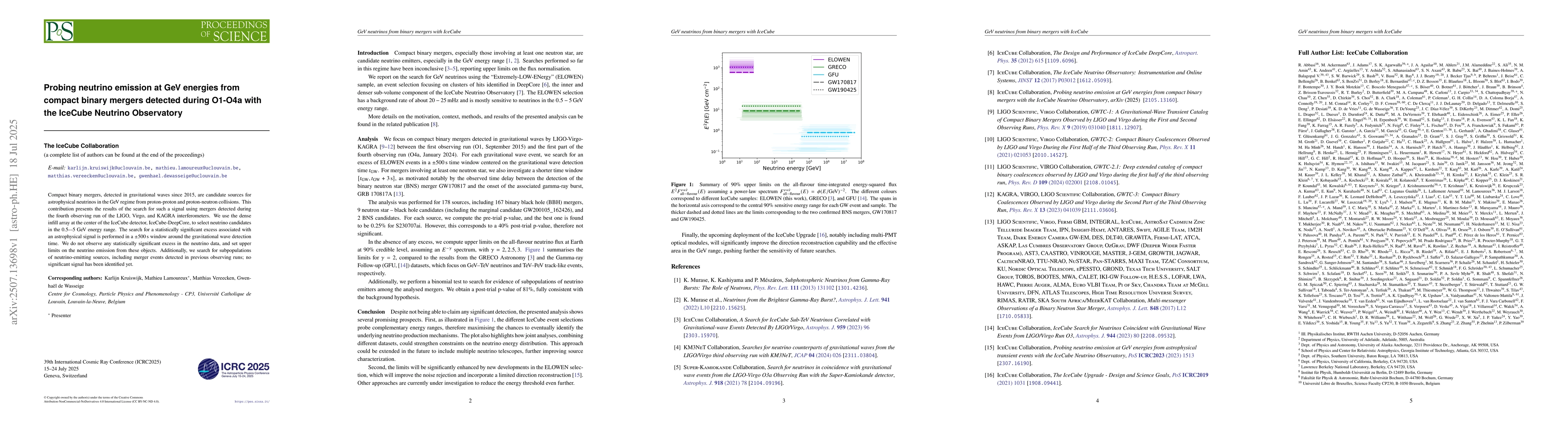 Compact binary mergers, detected in gravitational waves since 2015, are candidate sources for astrophysical neutrinos in the GeV regime from proton-proton and proton-neutron collisions. This contribution presents the results of the search for such a signal using mergers detected during the fourth observing run of the LIGO, Virgo, and KAGRA interferometers. We use the dense infill array at the center of the IceCube detector, IceCube-DeepCore, to select neutrino candidates in the 0.5-5 GeV energy range. The search for a statistically significant excess associated with an astrophysical signal is performed in a $\pm$ 500 s window around the gravitational wave detection time. We do not observe any statistically significant excess in the neutrino data, and set upper limits on the neutrino emission from these objects. Additionally, we search for subpopulations of neutrino-emitting sources, including merger events detected in previous observing runs; no significant signal has been identified yet.