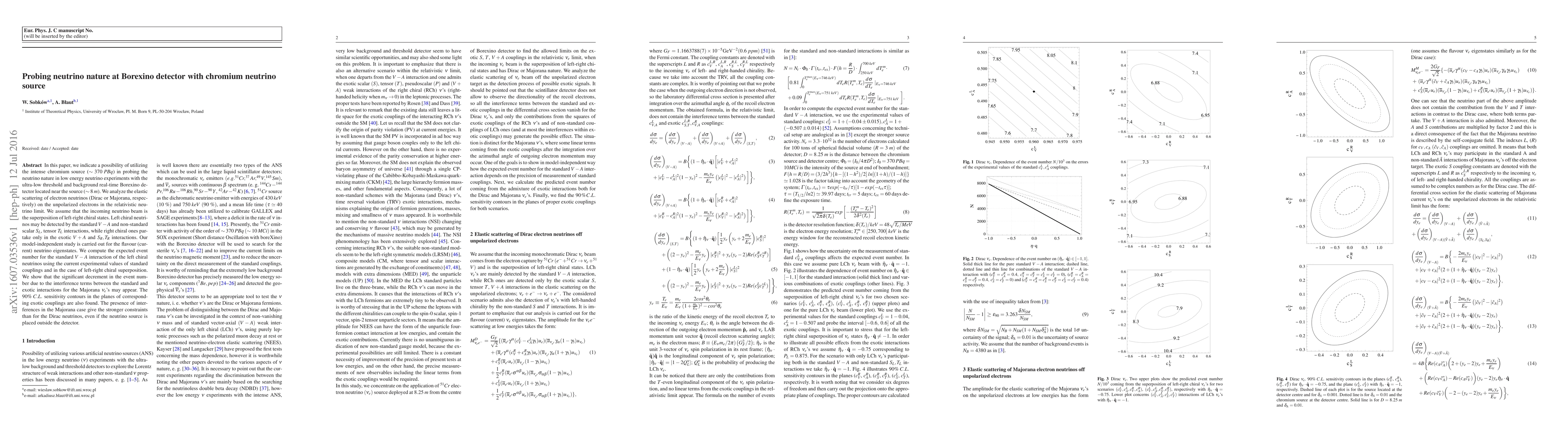 In this paper, we indicate a possibility of utilizing the intense chromium source ($\sim 370 PBq$) in probing the neutrino nature in low energy neutrino experiments with the ultra-low threshold and background real-time Borexino detector located near the source ($\sim 8 m$). We analyze the elastic scattering of electron neutrinos (Dirac or Majorana, respectively) on the unpolarized electrons in the relativistic neutrino limit. We assume that the incoming neutrino beam is the superposition of left-right chiral states. Left chiral neutrinos may be detected by the standard $V A$ and non-standard scalar $S_L$, tensor $T_L$ interactions, while right chiral ones partake only in the exotic $V + A$ and $S_R, T_R$ interactions. Our model-independent study is carried out for the flavour (current) neutrino eigenstates. We compute the expected event number for the standard $V-A$ interaction of the left chiral neutrinos using the current experimental values of standard couplings and in the case of left-right chiral superposition. We show that the significant decrement in the event number due to the interference terms between the standard and exotic interactions for the Majorana $\nu_e$'s may appear. The $90 \%$ C. L. sensitivity contours in the planes of corresponding exotic couplings are also found. The presence of interferences in the Majorana case gives the stronger constraints than for the Dirac neutrinos, even if the neutrino source is placed outside the detector.