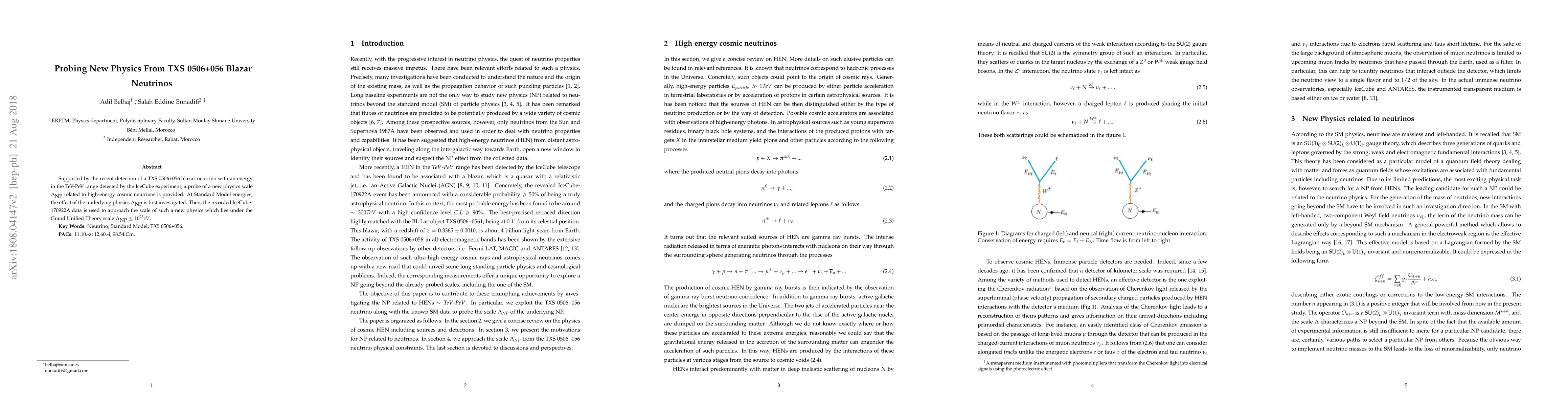 Supported by the recent detection of a TXS 0506+056 blazar neutrino with an energy in the TeV-PeV range detected by the IceCube experiment, a probe of a new physics scale LNP related to high-energy cosmic neutrinos is provided. At Standard Model energies, the effect of the underlying physics LNP is first investigated. Then, the recorded IceCube-170922A data is used to approach the scale of such a new physics which lies under the Grand Unified Theory scale 10^25eV.