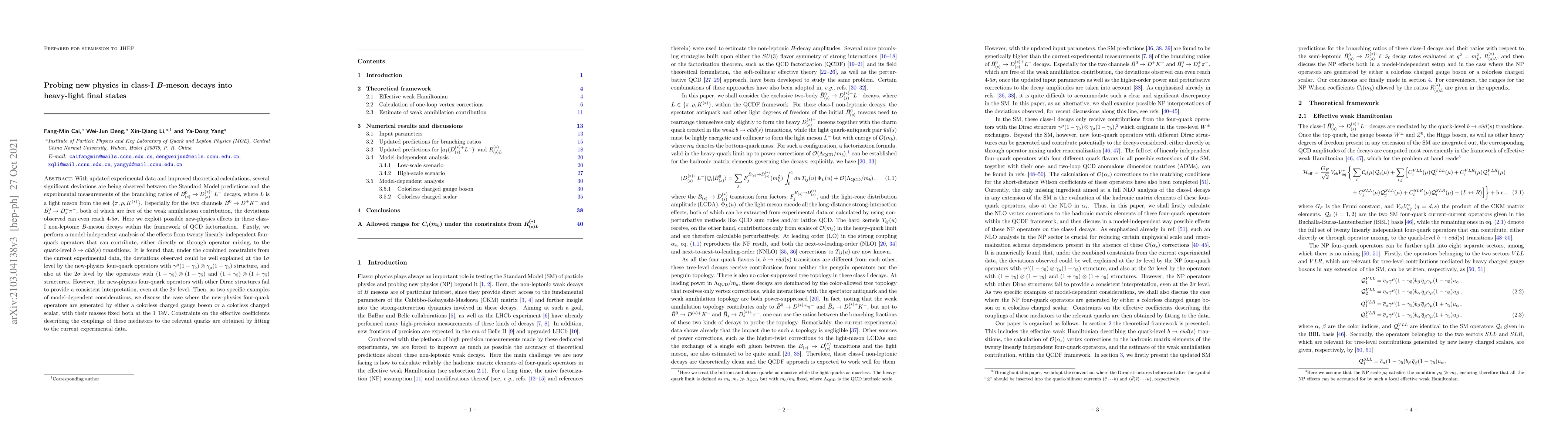 With updated experimental data and improved theoretical calculations, several significant deviations are being observed between the Standard Model predictions and the experimental measurements of the branching ratios of $\bar{B}_{(s)}^0\to D_{(s)}^{(*)+} L^-$ decays, where $L$ is a light meson from the set $\{\pi,\rho,K^{(\ast)}\}$. Especially for the two channels $\bar{B}^0\to D^{+}K^-$ and $\bar{B}_{s}^0\to D_{s}^{+}\pi^-$, both of which are free of the weak annihilation contribution, the deviations observed can even reach 4-5$\sigma$. Here we exploit possible new-physics effects in these class-I non-leptonic $B$-meson decays within the framework of QCD factorization. Firstly, we perform a model-independent analysis of the effects from twenty linearly independent four-quark operators that can contribute, either directly or through operator mixing, to the quark-level $b\to c\bar{u} d(s)$ transitions. It is found that, under the combined constraints from the current experimental data, the deviations observed could be well explained at the $1\sigma$ level by the new-physics four-quark operators with $\gamma^{\mu}(1-\gamma_5)\otimes\gamma_{\mu} (1-\gamma_5)$ structure, and also at the $2\sigma$ level by the operators with $(1+\gamma_5)\otimes(1-\gamma_5)$ and $(1+\gamma_5)\otimes(1+\gamma_5)$ structures. However, the new-physics four-quark operators with other Dirac structures fail to provide a consistent interpretation, even at the $2\sigma$ level. Then, as two specific examples of model-dependent considerations, we discuss the case where the new-physics four-quark operators are generated by either a colorless charged gauge boson or a colorless charged scalar, with their masses fixed both at the $1$~TeV. Constraints on the effective coefficients describing the couplings of these mediators to the relevant quarks are obtained by fitting to the current experimental data.