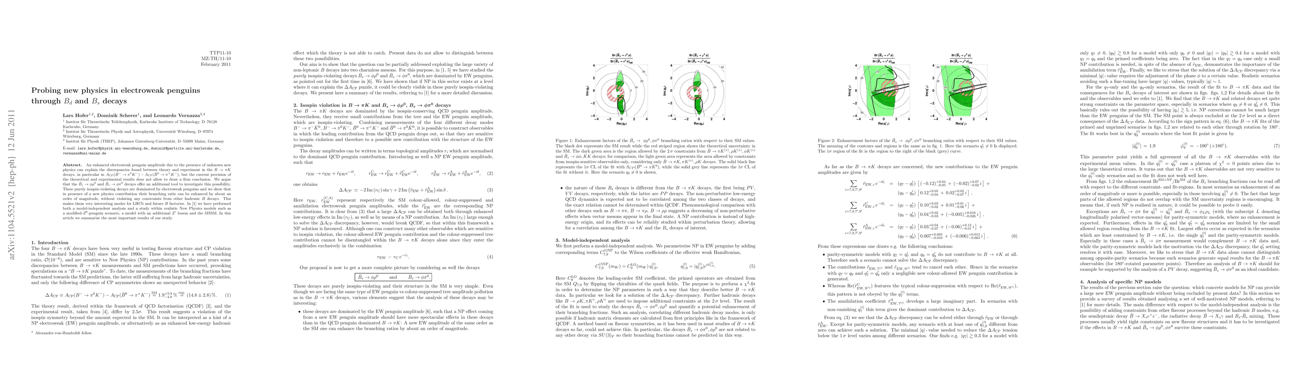 An enhanced electroweak penguin amplitude due to the presence of unknown new physics can explain the discrepancies found between theory and experiment in the B -> pi K decays, in particular in A_CP(B^- -> pi^0 K^-) - A_CP(\bar{B}^0 -> pi^+ K^-), but the current precision of the theoretical and experimental results does not allow to draw a firm conclusion. We argue that the \bar{B}_s -> phi rho^0 and \bar{B}_s -> phi pi^0 decays offer an additional tool to investigate this possibility. These purely isospin-violating decays are dominated by electroweak penguins and we show that in presence of a new physics contribution their branching ratio can be enhanced by about an order of magnitude, without violating any constraints from other hadronic B decays. This makes them very interesting modes for LHCb and future B factories. In arXiv:1011.6319 we have performed both a model-independent analysis and a study within realistic New Physics models such as a modified-Z^0-penguin scenario, a model with an additional Z' boson and the MSSM. In this article we summarise the most important results of our study.