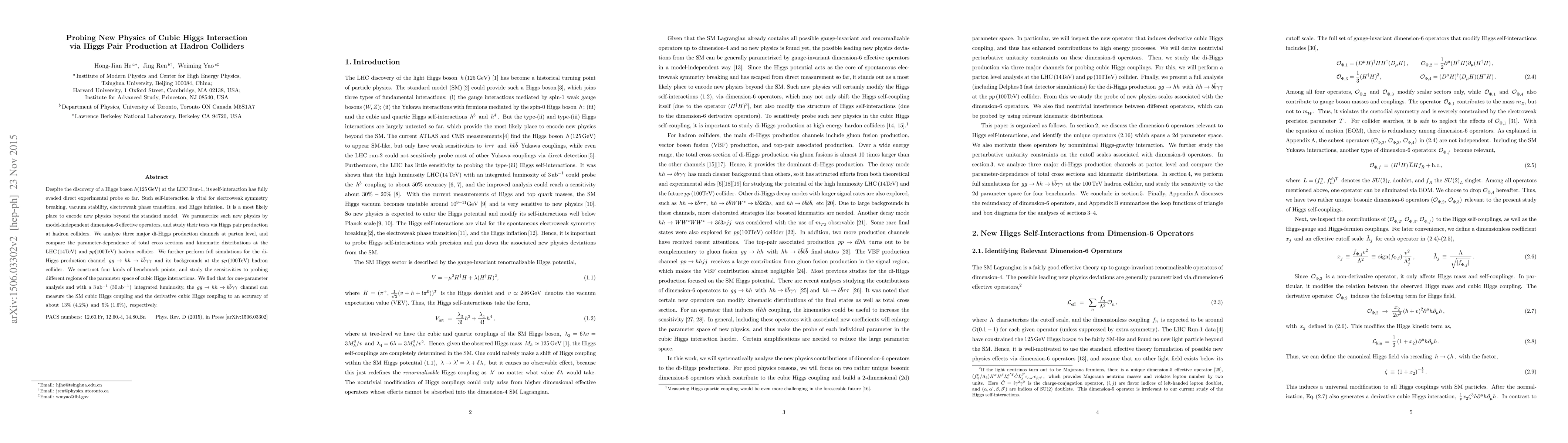 Despite the discovery of a Higgs boson h(125GeV) at the LHC Run-1, its self-interaction has fully evaded direct experimental probe so far. Such self-interaction is vital for electroweak symmetry breaking, vacuum stability and electroweak phase transition, and Higgs inflation. It is a most likely place to encode new physics beyond the standard model. We parametrize such new physics by model-independent dimension-6 effective operators, and study their tests via Higgs pair production at hadron colliders. We analyze three major di-Higgs production channels at parton level, and compare the parameter-dependence of total cross sections and kinematic distributions at the LHC(14TeV) and pp(100TeV) hadron collider. We further perform full simulations for the di-Higgs production channel $gg\to hh \to b\bar{b}\gamma\gamma$ and its backgrounds at the pp(100TeV) hadron collider. We construct four kinds of benchmark points, and study the sensitivities to probing different regions of the parameter space of cubic Higgs interactions. We find that for one-parameter analysis and with a 3/ab (30/ab) integrated luminosity, the $gg\to hh \to b\bar{b}\gamma\gamma$ channel can measure the SM cubic Higgs coupling and the derivative cubic Higgs coupling to an accuracy of about 13% (4.2%) and 5% (1.6%), respectively.