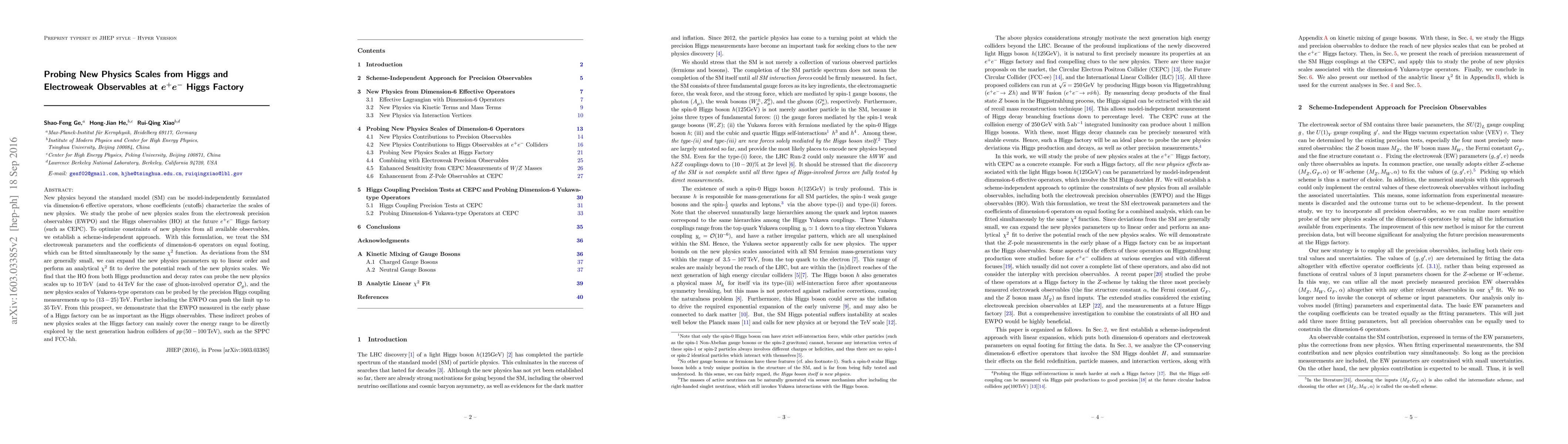 This paper explores the potential of the future $e^+e^-$ Higgs factory to probe new physics scales beyond the Standard Model using electroweak precision and Higgs observables. It establishes a scheme-independent approach to fit the coefficients of dimension-6 effective operators, finding that Higgs observables can probe new physics scales up to 10TeV, with the inclusion of electroweak precision observables extending this limit to 35TeV.