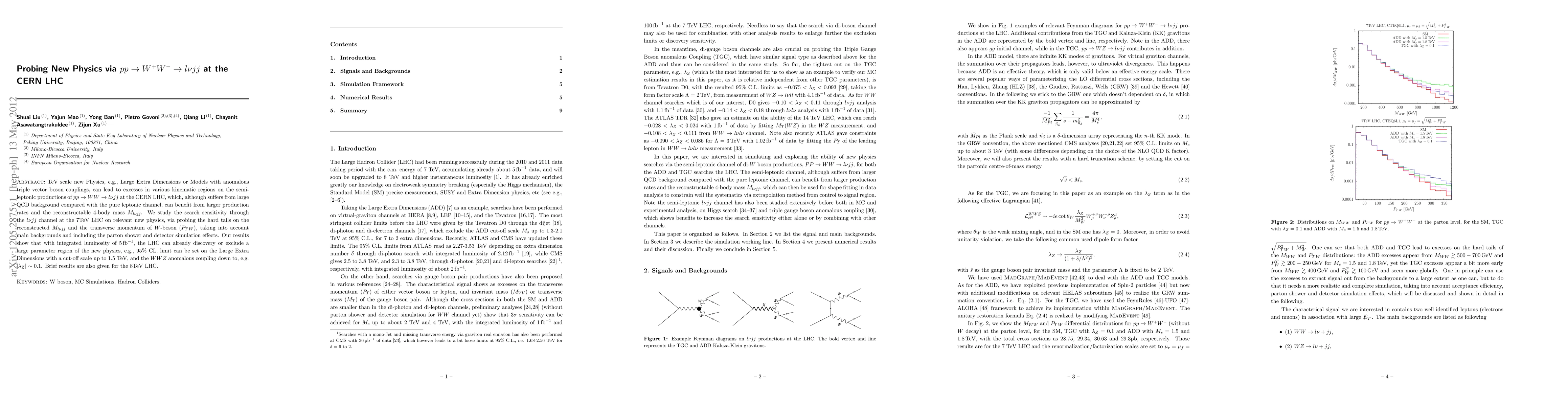 This paper investigates the potential of the pp -> W+W- -> lvjj channel at the CERN LHC to probe new physics, such as Large Extra Dimensions and anomalous triple vector boson couplings, despite large QCD background. Results show that with 5fb^-1 luminosity, the LHC can discover or exclude significant new physics regions, including limits on the Large Extra Dimensions cut-off scale up to 1.5 TeV and WWZ anomalous coupling down to |\lambda_Z| ~ 0.1.
