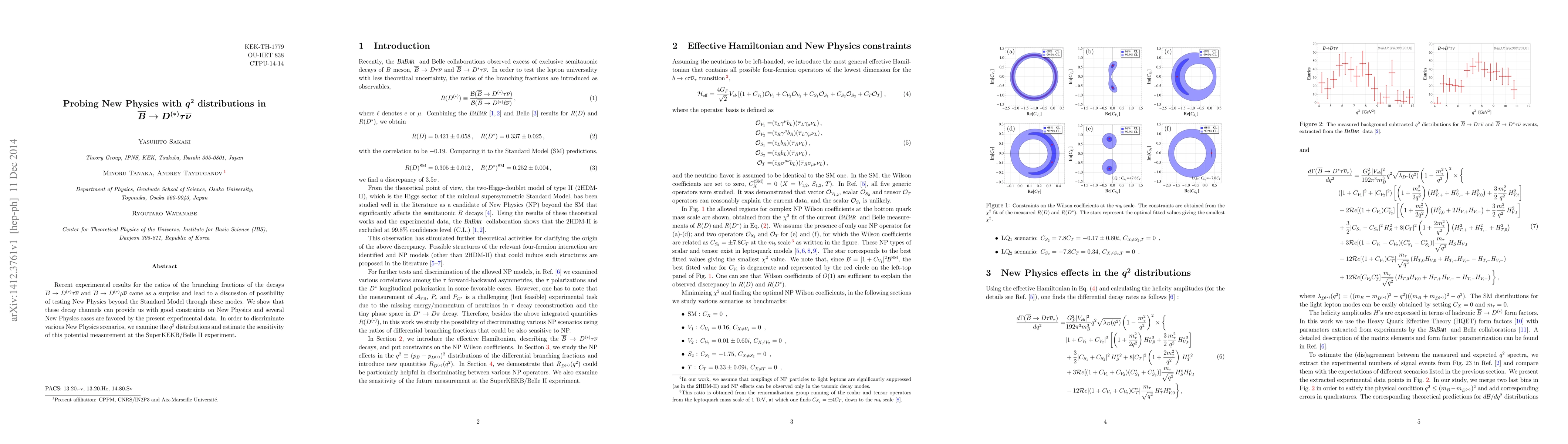 Recent experimental results for the ratios of the branching fractions of the decays $\bar{B} \to D^{(*)} \tau \bar\nu$ and $\bar{B} \to D^{(*)} \mu \bar\nu$ came as a surprise and lead to a discussion of possibility of testing New Physics beyond the Standard Model through these modes. We show that these decay channels can provide us with good constraints on New Physics and several New Physics cases are favored by the present experimental data. In order to discriminate various New Physics scenarios, we examine the $q^2$ distributions and estimate the sensitivity of this potential measurement at the SuperKEKB/Belle II experiment.