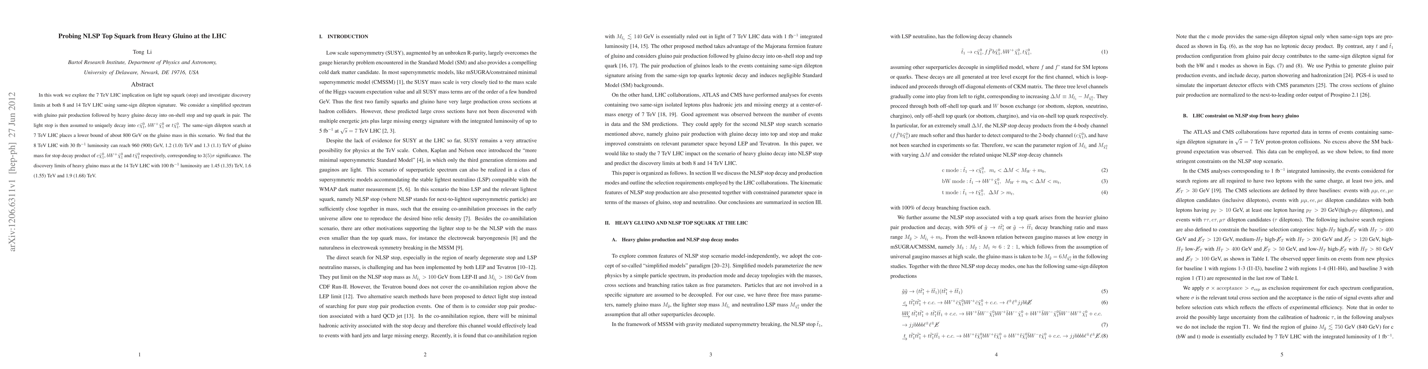 In this work we explore the 7 TeV LHC implication on light top squark (stop) and investigate discovery limits at both 8 and 14 TeV LHC using same-sign dilepton signature. We consider a simplified spectrum with gluino pair production followed by heavy gluino decay into on-shell stop and top quark in pair. The light stop is then assumed to uniquely decay into c\tilde{\chi}_1^0, bW^+\tilde{\chi}_1^0 or t\tilde{\chi}_1^0. The same-sign dilepton search at 7 TeV LHC places a lower bound of about 800 GeV on the gluino mass in this scenario. We find that the 8 TeV LHC with 30 fb^{-1} luminosity can reach 960 (900) GeV, 1.2 (1.0) TeV and 1.3 (1.1) TeV of gluino mass for stop decay product of c\tilde{\chi}_1^0, bW^+\tilde{\chi}_1^0 and t\tilde{\chi}_1^0 respectively, corresponding to 3 (5) \sigma significance. The discovery limits of heavy gluino mass at the 14 TeV LHC with 100 fb^{-1} luminosity are 1.45 (1.35) TeV, 1.6 (1.55) TeV and 1.9 (1.68) TeV.