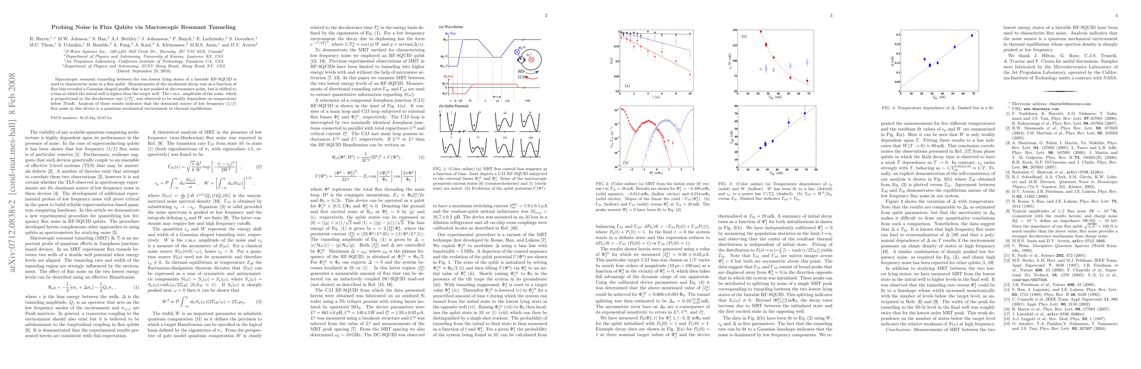 This paper investigates noise in flux qubits using macroscopic resonant tunneling in RF-SQUIDs, finding that the noise profile is Gaussian-shaped and shifted from the resonance point. The noise's r.m.s. amplitude is weakly temperature-dependent below 70 mK, suggesting that low-frequency flux noise is primarily due to a thermal quantum mechanical environment.