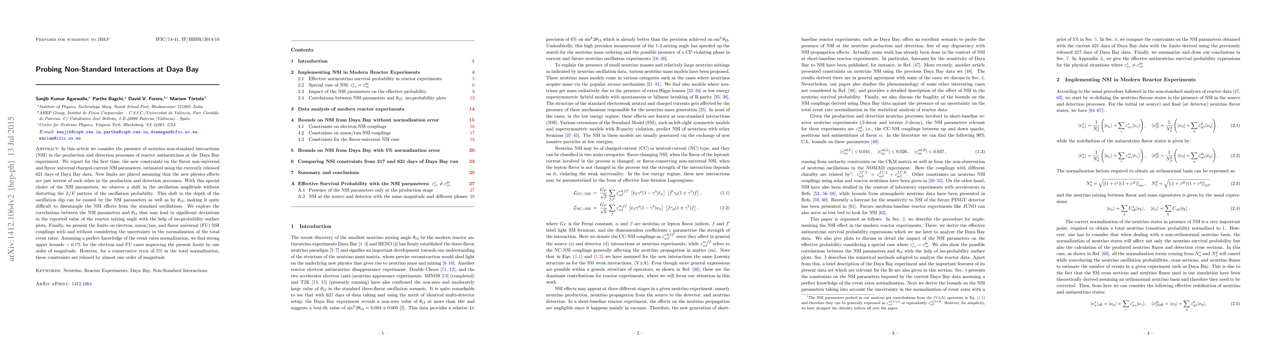 The Daya Bay experiment investigates neutrino non-standard interactions (NSI), providing new constraints on flavor non-universal and universal charged-current NSI parameters using 621 days of data. The study finds strong upper bounds of ~0.1% for electron and flavor universal NSI couplings, improving current limits by an order of magnitude under ideal normalization conditions.