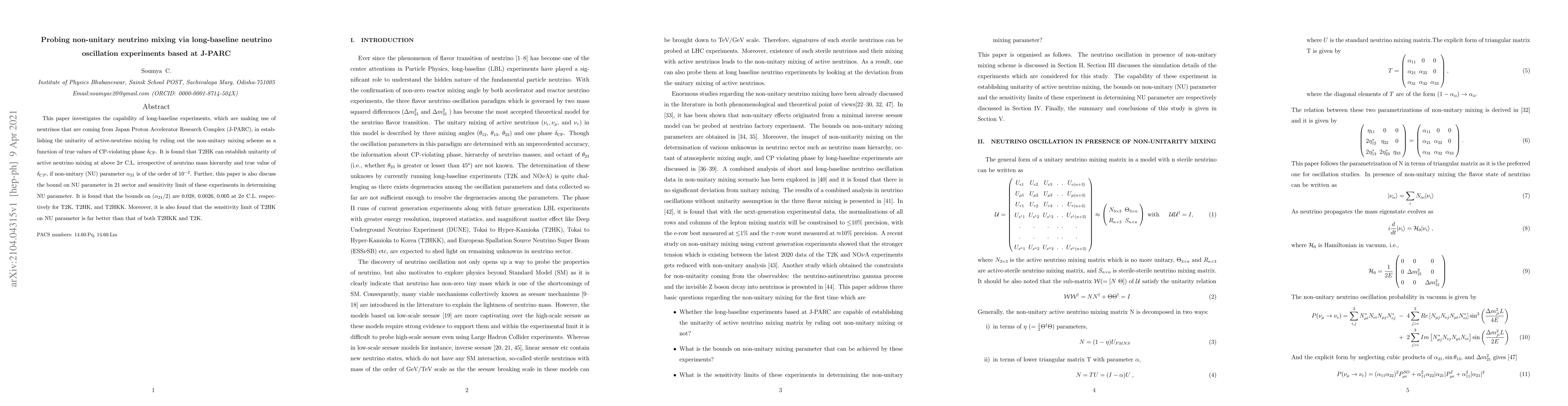 The research uses simulations with GLoBES and MonteCUBES to analyze the capability of long-baseline neutrino experiments based at J-PARC (T2K, T2HK, and T2HKK) in probing non-unitary neutrino mixing.