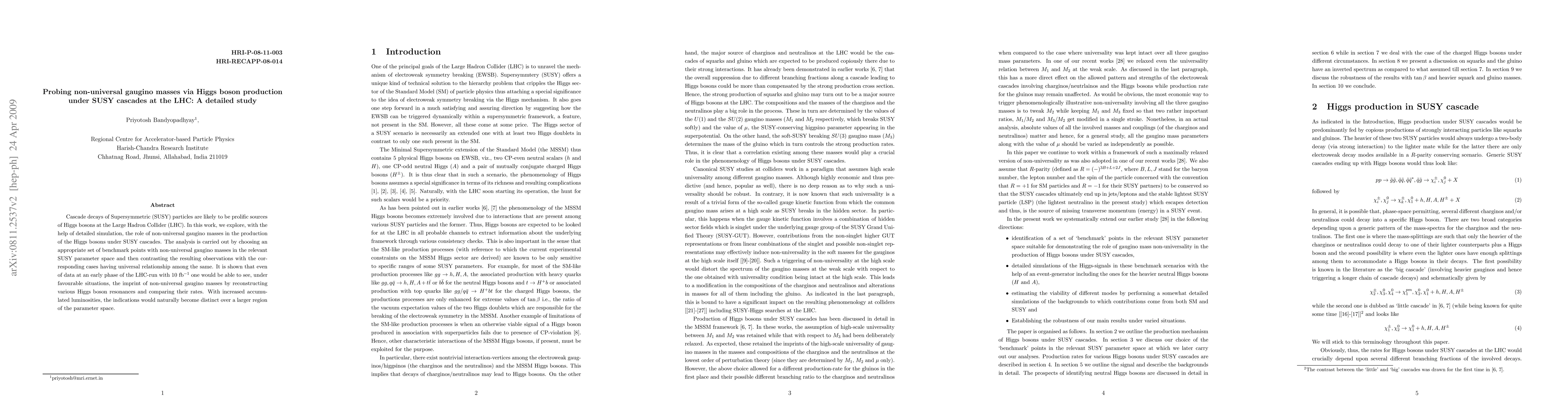 This paper investigates how non-universal gaugino masses influence the production of Higgs bosons via SUSY cascades at the LHC, using detailed simulations. It demonstrates that early LHC data can reveal the imprints of these non-universalities through the analysis of Higgs boson resonance rates.