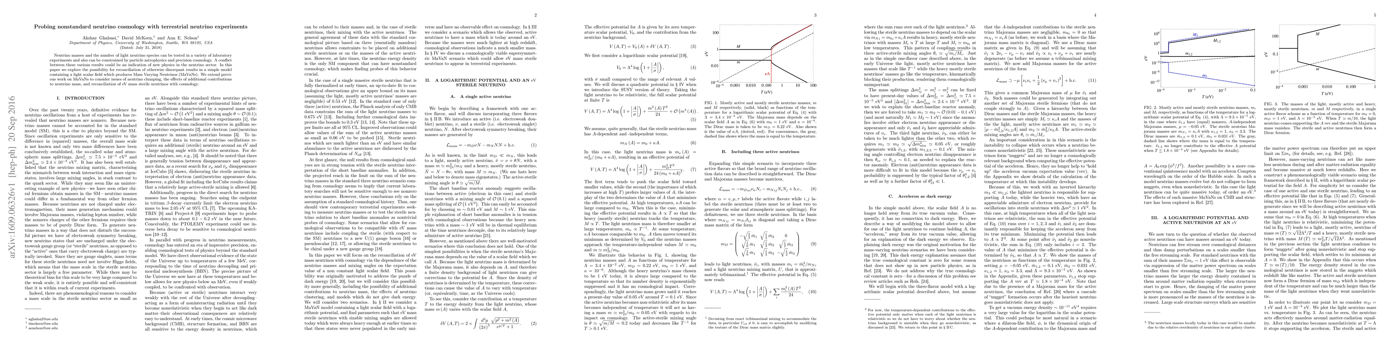 Neutrino masses and the number of light neutrino species can be tested in a variety of laboratory experiments and also can be constrained by particle astrophysics and precision cosmology. A conflict between these various results could be an indication of new physics in the neutrino sector. In this paper we explore the possibility for reconciliation of otherwise discrepant results in a simple model containing a light scalar field which produces Mass Varying Neutrinos (MaVaNs). We extend previous work on MaVaNs to consider issues of neutrino clumping, the effects of additional contributions to neutrino mass, and reconciliation of eV mass sterile neutrinos with cosmology.