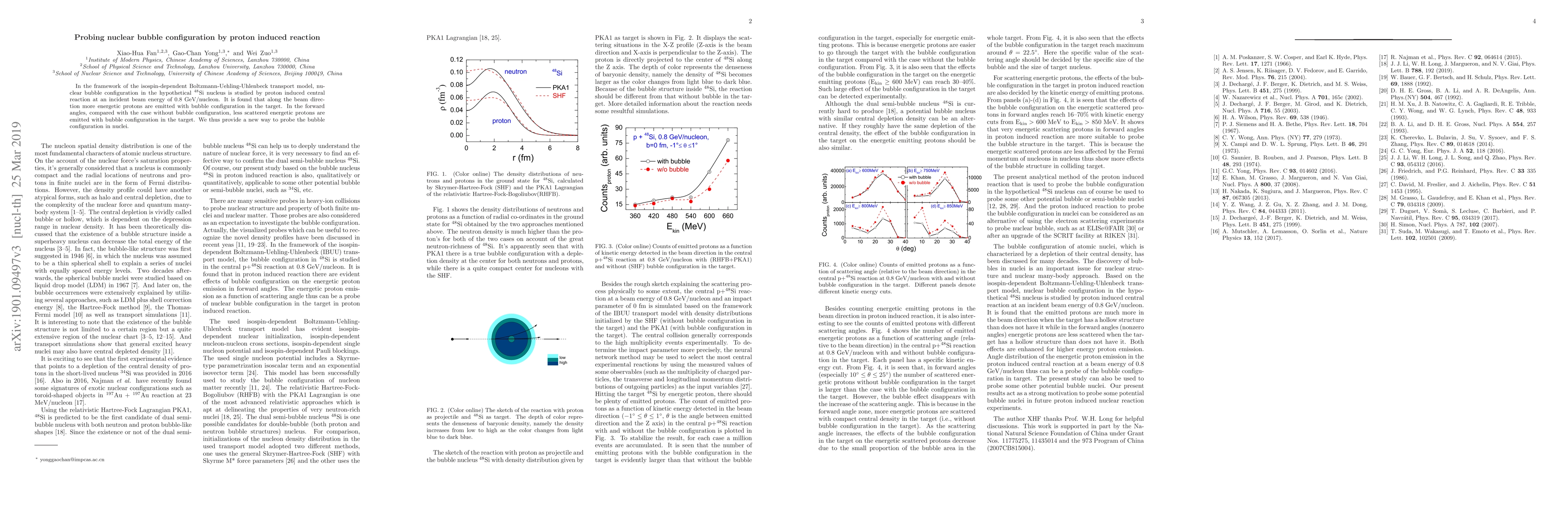 The paper presents a detailed analysis using the isospin-dependent Boltzmann-Uehling-Uhlenbeck transport model to demonstrate the effects of nuclear bubble configuration on proton emission in proton-induced reactions.
