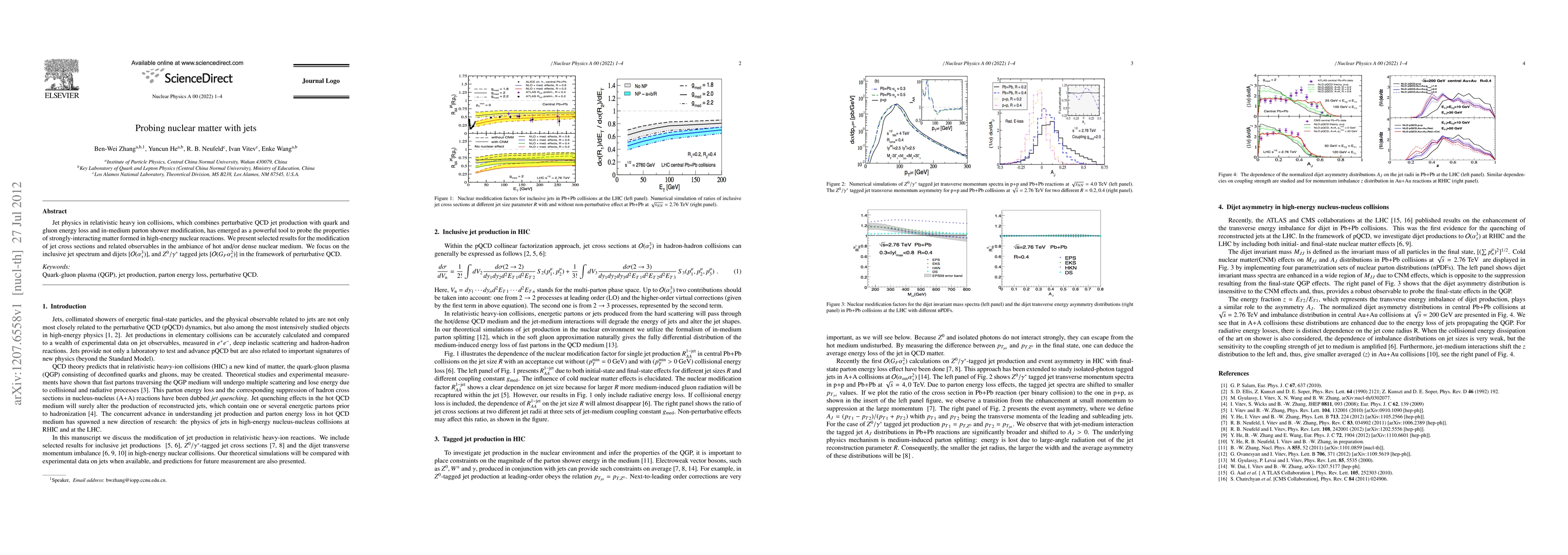 Research explores how jets in high-energy nuclear collisions can reveal properties of strongly-interacting matter. It finds modifications to jet spectra and observables in the presence of hot and dense nuclear medium.