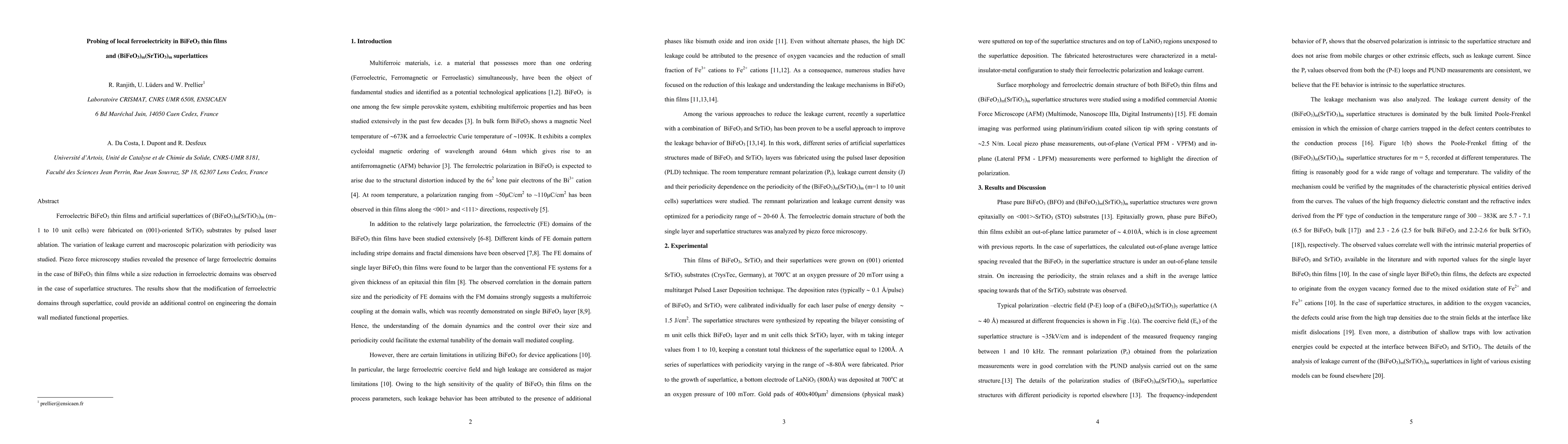 This study investigates the ferroelectric properties of BiFeO3 thin films and superlattices via leakage current and polarization measurements, revealing large ferroelectric domains in thin films and reduced domains in superlattices, suggesting domain engineering through superlattice design can enhance domain wall-mediated functionalities.