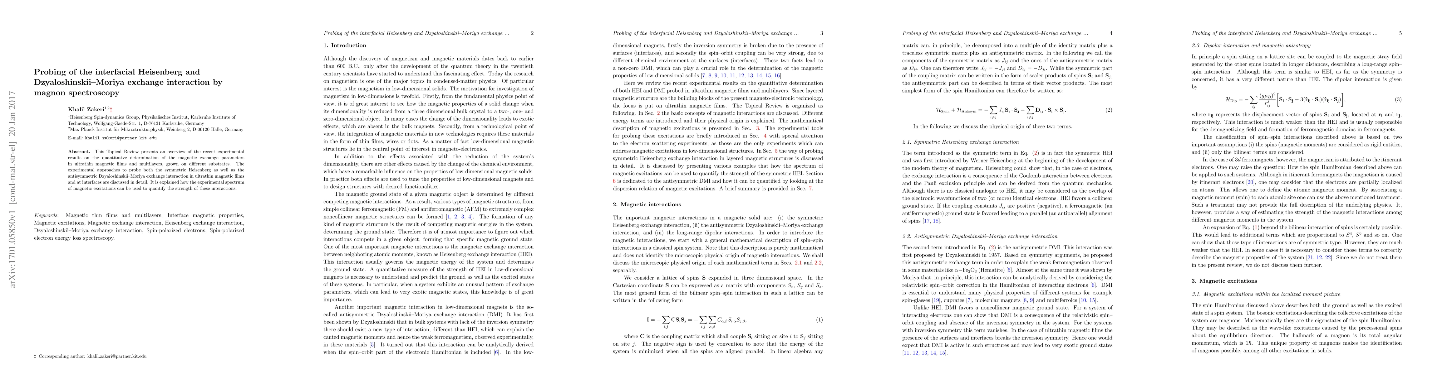 This review details recent experimental methods for determining magnetic exchange parameters in ultrathin magnetic films, focusing on both Heisenberg and Dzyaloshinskii-Moriya interactions, using magnon spectroscopy to quantify these interactions. The study highlights how magnetic excitation spectra reveal the strength of these interfacial interactions.