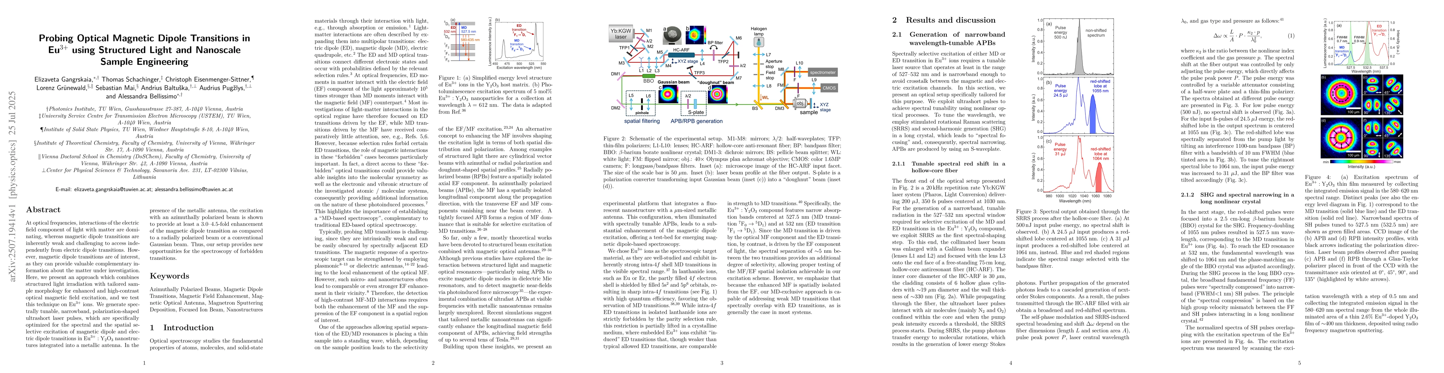 At optical frequencies, interactions of the electric field component of light with matter are dominating, whereas magnetic dipole transitions are inherently weak and challenging to access independently from electric dipole transitions. However, magnetic dipole transitions are of interest, as they can provide valuable complementary information about the matter under investigation. Here, we present an approach which combines structured light irradiation with tailored sample morphology for enhanced and highcontrast optical magnetic field excitation, and we test this technique on Eu$^{3+}$ ions. We generate spectrally tunable, narrowband, polarization-shaped ultrashort laser pulses, which are specifically optimized for the spectral and the spatial selective excitation of magnetic dipole and electric dipole transitions in Eu$^{3+}$ : Y$_2$O$_3$ nanostructures integrated into a metallic antenna. In the presence of the metallic antenna, the excitation with an azimuthally polarized beam is shown to provide at least a 3.0-4.5-fold enhancement of the magnetic dipole transition as compared to a radially polarized beam or a conventional Gaussian beam. Thus, our setup provides new opportunities for the spectroscopy of forbidden transitions.