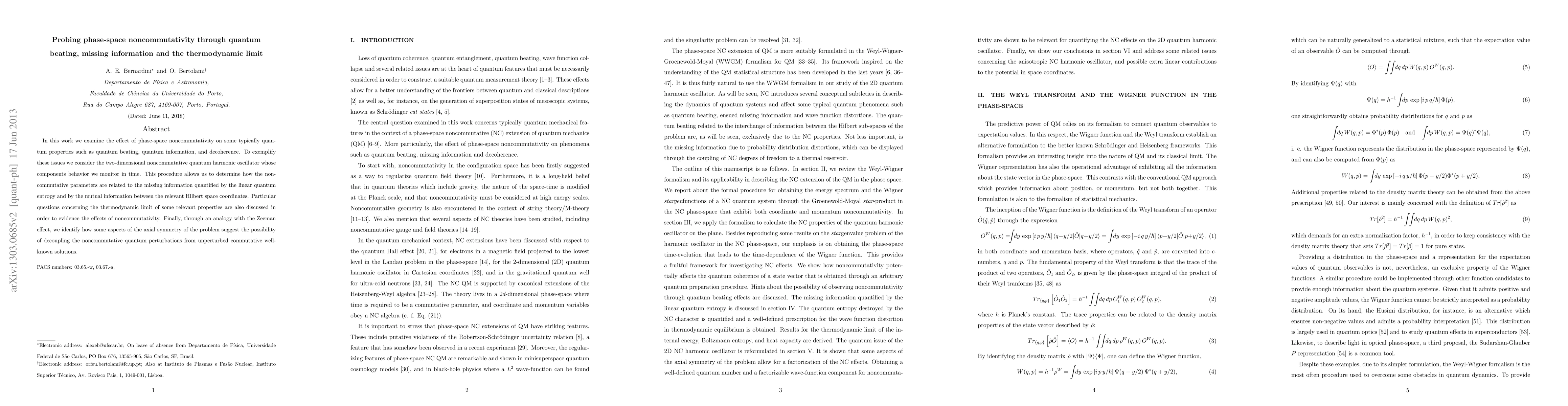 In this work we examine the effect of phase-space noncommutativity on some typically quantum properties such as quantum beating, quantum information, and decoherence. To exemplify these issues we consider the two-dimensional noncommutative quantum harmonic oscillator whose components behavior we monitor in time. This procedure allows us to determine how the noncommutative parameters are related to the missing information quantified by the linear quantum entropy and by the mutual information between the relevant Hilbert space coordinates. Particular questions concerning the thermodynamic limit of some relevant properties are also discussed in order to evidence the effects of noncommutativity. Finally, through an analogy with the Zeeman effect, we identify how some aspects of the axial symmetry of the problem suggest the possibility of decoupling the noncommutative quantum perturbations from unperturbed commutative well-known solutions.
