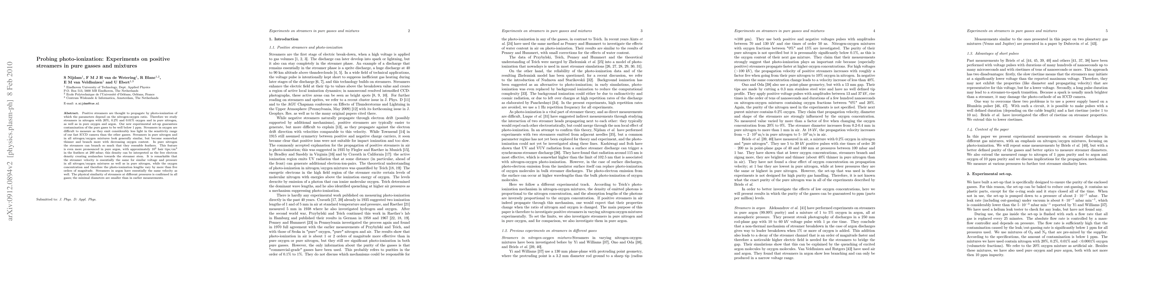 This study investigates positive streamers in pure nitrogen, nitrogen-oxygen mixtures, and pure oxygen and argon gases, focusing on how photo-ionization parameters vary with nitrogen:oxygen ratios. The experimental setup ensures gas purity below 1 ppm, revealing that streamers in nitrogen and mixtures become thinner and more branched with lower oxygen content, while the streamer velocity remains consistent across mixtures despite varying photo-ionization lengths.
