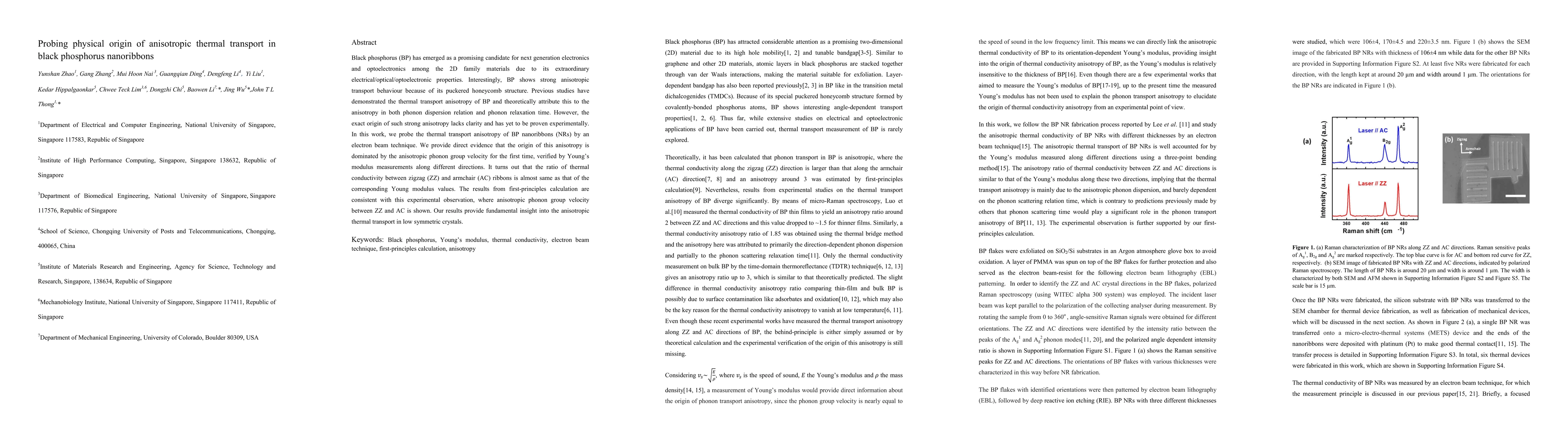 This study experimentally demonstrates that the anisotropic thermal transport in black phosphorus nanoribbons is primarily due to the anisotropic phonon group velocity, verified by electron beam techniques and Young modulus measurements. First-principles calculations support these findings, highlighting the importance of this anisotropy in low-symmetry crystals.