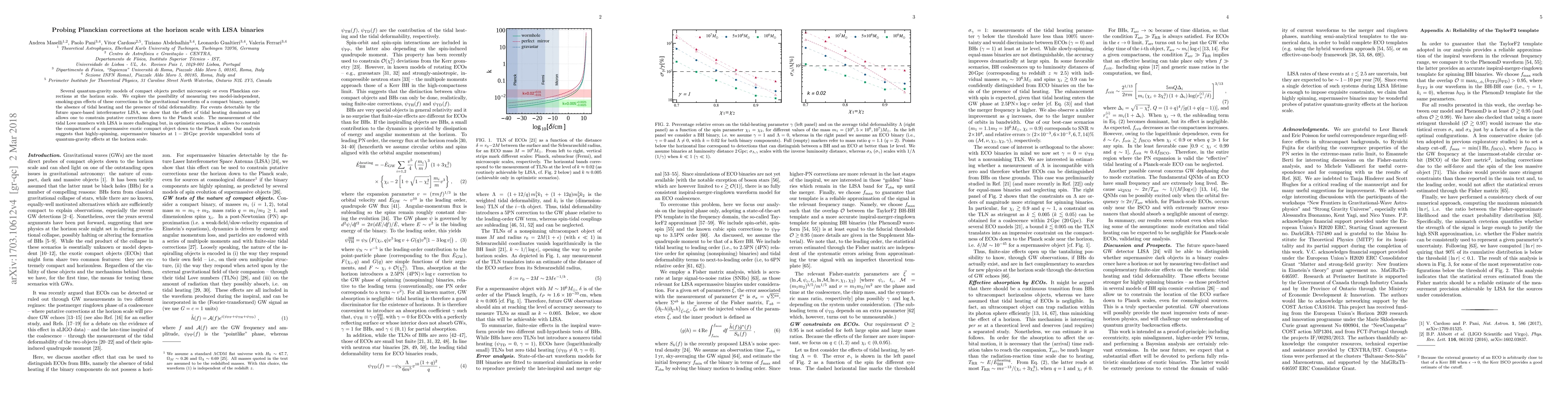 Several quantum-gravity models of compact objects predict microscopic or even Planckian corrections at the horizon scale. We explore the possibility of measuring two model-independent, smoking-gun effects of these corrections in the gravitational waveform of a compact binary, namely the absence of tidal heating and the presence of tidal deformability. For events detectable by the future space-based interferometer LISA, we show that the effect of tidal heating dominates and allows one to constrain putative corrections down to the Planck scale. The measurement of the tidal Love numbers with LISA is more challenging but, in optimistic scenarios, it allows to constrain the compactness of a supermassive exotic compact object down to the Planck scale. Our analysis suggests that highly-spinning, supermassive binaries at 1-20 Gpc provide unparalleled tests of quantum-gravity effects at the horizon scale.
