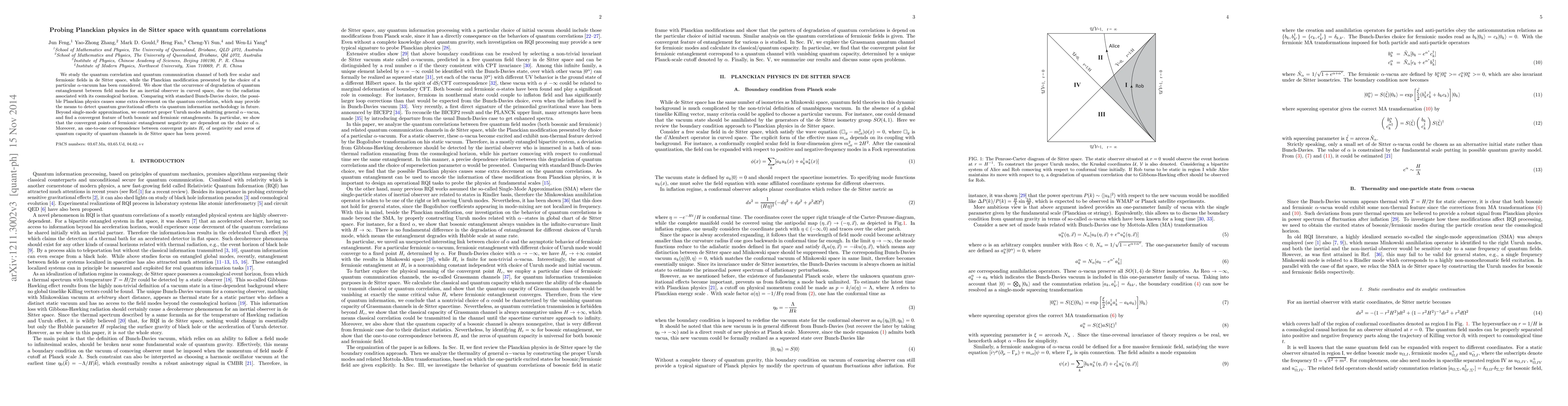 We study the quantum correlation and quantum communication channel of both free scalar and fermionic fields in de Sitter space, while the Planckian modification presented by the choice of a particular $\alpha$-vacuum has been considered. We show that the occurrence of degradation of quantum entanglement between field modes for an inertial observer in curved space, due to the radiation associated with its cosmological horizon. Comparing with standard Bunch-Davies choice, the possible Planckian physics causes some extra decrement on the quantum correlation, which may provide the means to detect quantum gravitational effects via quantum information methodology in future. Beyond single-mode approximation, we construct proper Unruh modes admitting general $\alpha-$vacua, and find a convergent feature of both bosonic and fermionic entanglements. In particular, we show that the convergent points of fermionic entanglement negativity are dependent on the choice of $\alpha$. Moreover, an one-to-one correspondence between convergent points $H_c$ of negativity and zeros of quantum capacity of quantum channels in de Sitter space has been proved.
