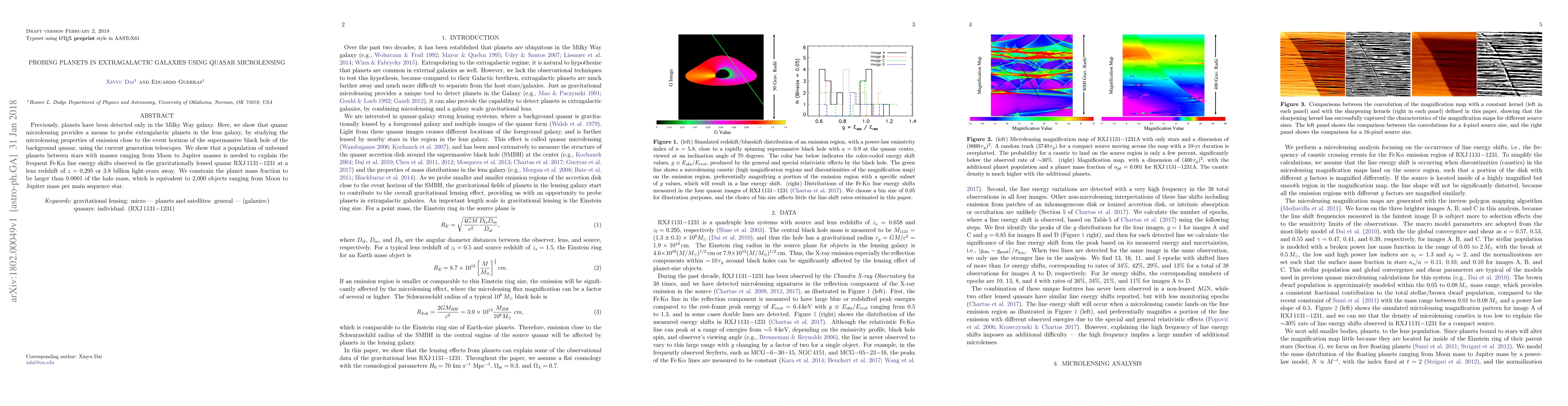 This research demonstrates that quasar microlensing can detect extragalactic planets in lens galaxies, revealing a population of unbound planets between Moon and Jupiter masses explaining frequent Fek line shifts in the quasar RXJ1131-1231. The study constrains the planet mass fraction to be greater than 0.0001 of the halo mass, indicating 2,000 such planets per main sequence star.