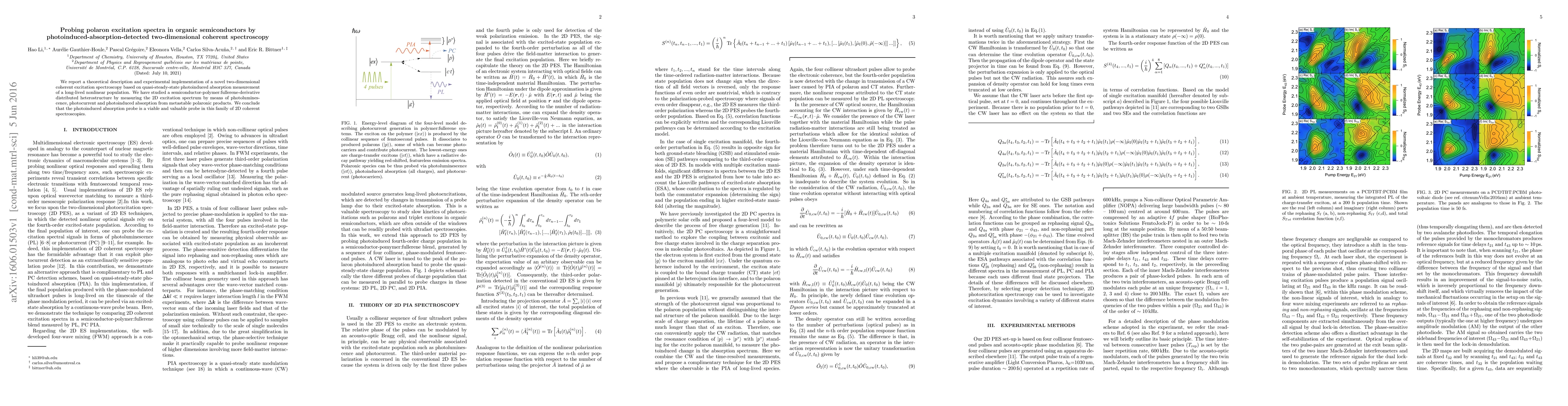 This paper presents a theoretical and experimental study of a novel two-dimensional coherent spectroscopy technique using photoinduced absorption to probe polaron excitation spectra in organic semiconductors. The method is applied to a semiconductor-polymer:fullerene-derivative heterostructure, demonstrating the effectiveness of the photoinduced absorption probe in this context.