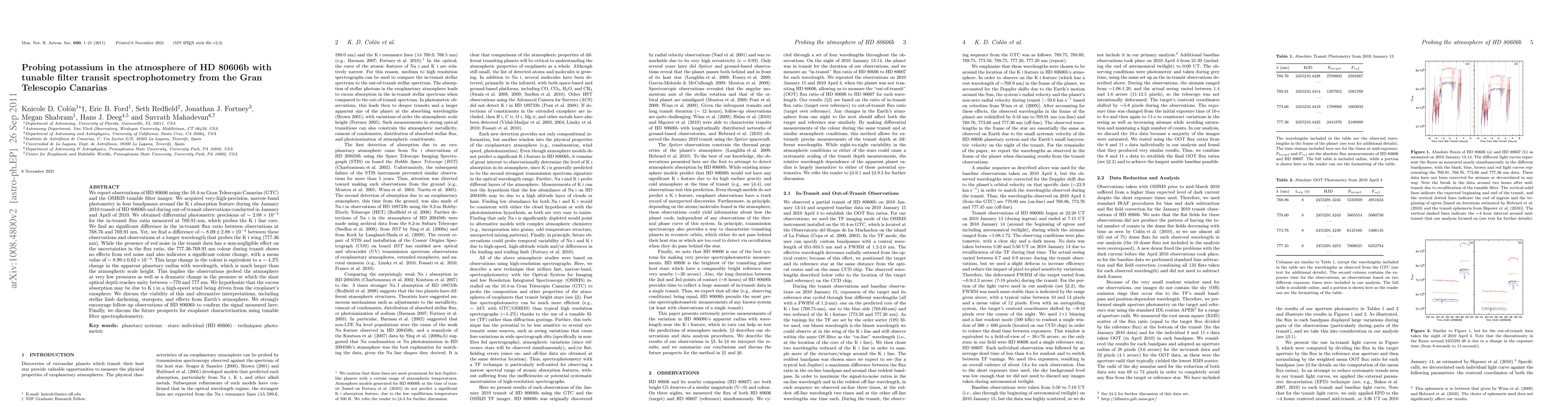 We report observations of HD 80606 using the 10.4-m Gran Telescopio Canarias (GTC) and the OSIRIS tunable filter imager. We acquired very-high-precision, narrow-band photometry in four bandpasses around the K I absorption feature during the January 2010 transit of HD 80606b and during out-of-transit observations conducted in January and April of 2010. We obtained differential photometric precisions of \sim 2.08e-4 for the in-transit flux ratio measured at 769.91-nm, which probes the K I line core. We find no significant difference in the in-transit flux ratio between observations at 768.76 and 769.91 nm. Yet, we find a difference of \sim 8.09 \pm 2.88e-4 between these observations and observations at a longer wavelength that probes the K I wing (777.36 nm). While the presence of red noise in the transit data has a non-negligible effect on the uncertainties in the flux ratio, the 777.36-769.91 nm colour during transit shows no effects from red noise and also indicates a significant colour change, with a mean value of \sim 8.99\pm0.62e-4. This large change in the colour is equivalent to a \sim 4.2% change in the apparent planetary radius with wavelength, which is much larger than the atmospheric scale height. This implies the observations probed the atmosphere at very low pressures as well as a dramatic change in the pressure at which the slant optical depth reaches unity between \sim770 and 777 nm. We hypothesize that the excess absorption may be due to K I in a high-speed wind being driven from the exoplanet's exosphere. We discuss the viability of this and alternative interpretations, including stellar limb darkening, starspots, and effects from Earth's atmosphere. We strongly encourage follow-up observations of HD 80606b to confirm the signal measured here. Finally, we discuss the future prospects for exoplanet characterization using tunable filter spectrophotometry.