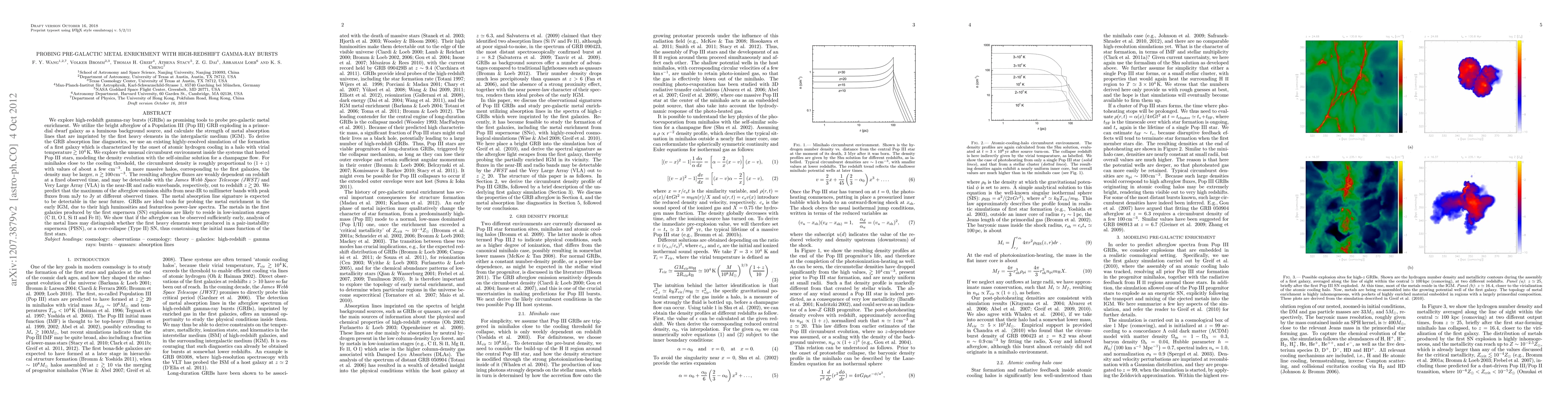 This paper investigates high-redshift gamma-ray bursts (GRBs) as tools to study pre-galactic metal enrichment, using simulations to model the absorption lines from the first heavy elements in the intergalactic medium. The study predicts detectable afterglow emissions with JWST and VLA, and suggests that early observations of these afterglows can reveal details about the initial mass function of the first stars.