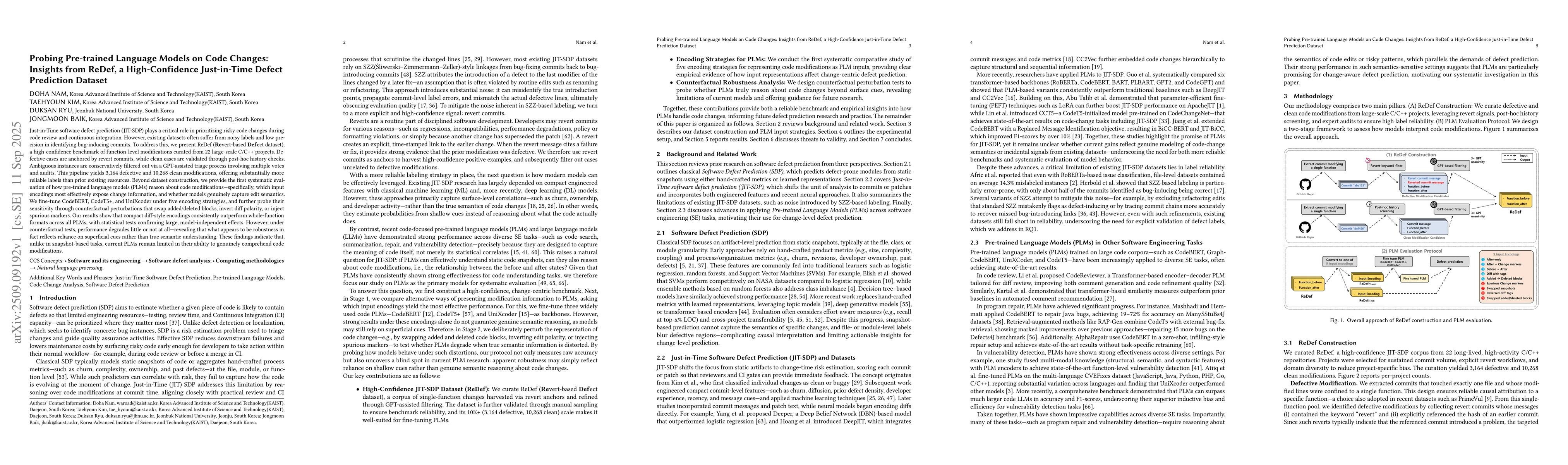 Just-in-Time software defect prediction (JIT-SDP) plays a critical role in prioritizing risky code changes during code review and continuous integration. However, existing datasets often suffer from noisy labels and low precision in identifying bug-inducing commits. To address this, we present ReDef (Revert-based Defect dataset), a high-confidence benchmark of function-level modifications curated from 22 large-scale C/C++ projects. Defective cases are anchored by revert commits, while clean cases are validated through post-hoc history checks. Ambiguous instances are conservatively filtered out via a GPT-assisted triage process involving multiple votes and audits. This pipeline yields 3,164 defective and 10,268 clean modifications, offering substantially more reliable labels than prior existing resources. Beyond dataset construction, we provide the first systematic evaluation of how pre-trained language models (PLMs) reason about code modifications -- specifically, which input encodings most effectively expose change information, and whether models genuinely capture edit semantics. We fine-tune CodeBERT, CodeT5+, and UniXcoder under five encoding strategies, and further probe their sensitivity through counterfactual perturbations that swap added/deleted blocks, invert diff polarity, or inject spurious markers. Our results show that compact diff-style encodings consistently outperform whole-function formats across all PLMs, with statistical tests confirming large, model-independent effects. However, under counterfactual tests, performance degrades little or not at all -- revealing that what appears to be robustness in fact reflects reliance on superficial cues rather than true semantic understanding. These findings indicate that, unlike in snapshot-based tasks, current PLMs remain limited in their ability to genuinely comprehend code modifications.