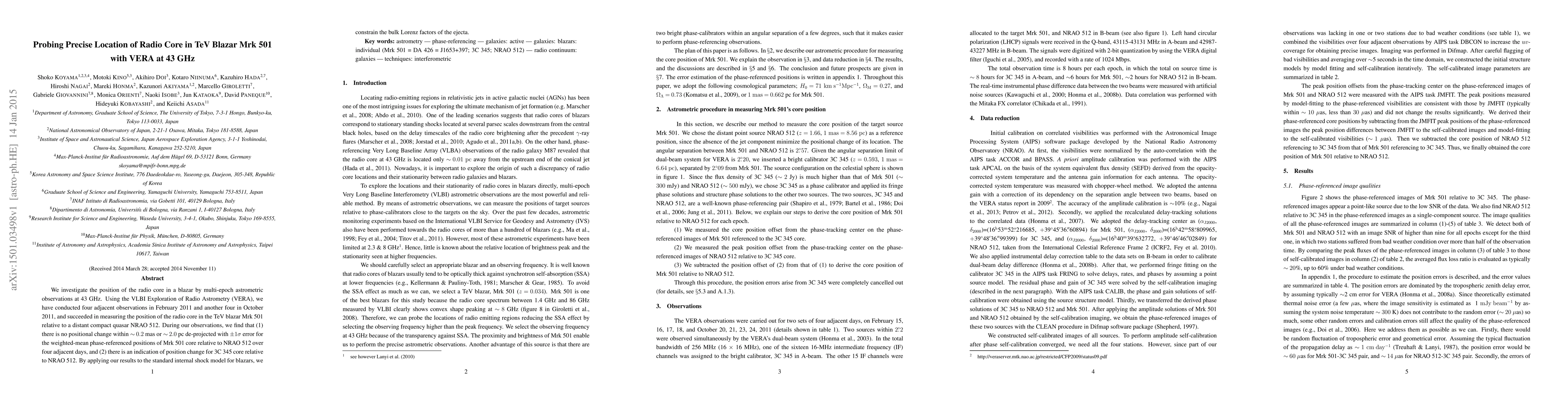We investigate the position of the radio core in a blazar by multi-epoch astrometric observations at 43 GHz. Using the VLBI Exploration of Radio Astrometry (VERA), we have conducted four adjacent observations in February 2011 and another four in October 2011, and succeeded in measuring the position of the radio core in the TeV blazar Mrk 501 relative to a distant compact quasar NRAO 512. During our observations, we find that (1) there is no positional change within ~0.2 mas or ~2.0 pc de-projected with $\pm1\sigma$ error for the weighted-mean phase-referenced positions of Mrk 501 core relative to NRAO 512 over four adjacent days, and (2) there is an indication of position change for 3C 345 core relative to NRAO 512. By applying our results to the standard internal shock model for blazars, we constrain the bulk Lorenz factors of the ejecta.