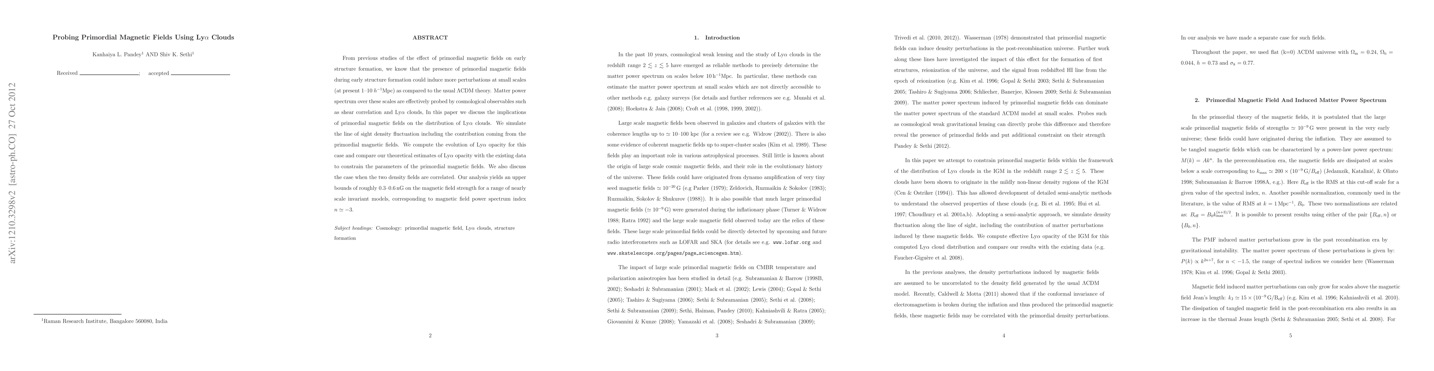 From previous studies of the effect of primordial magnetic fields on early structure formation, we know that the presence of primordial magnetic fields during early structure formation could induce more perturbations at small scales (at present 1-10 Mpc/h) as compared to the usual LCDM theory. Matter power spectrum over these scales are effectively probed by cosmological observables such as shear correlation and Ly-alpha clouds, In this paper we discuss the implications of primordial magnetic fields on the distribution of Ly-alpha clouds. We simulate the line of sight density fluctuation including the contribution coming from the primordial magnetic fields. We compute the evolution of Ly-alpha opacity for this case and compare our theoretical estimates of Ly-alpha opacity with the existing data to constrain the parameters of the primordial magnetic fields. We also discuss the case when the two density fields are correlated. Our analysis yields an upper bounds of roughly 0.3-0.6 nG on the magnetic field strength for a range of nearly scale invariant models, corresponding to magnetic field power spectrum index n \simeq -3.
