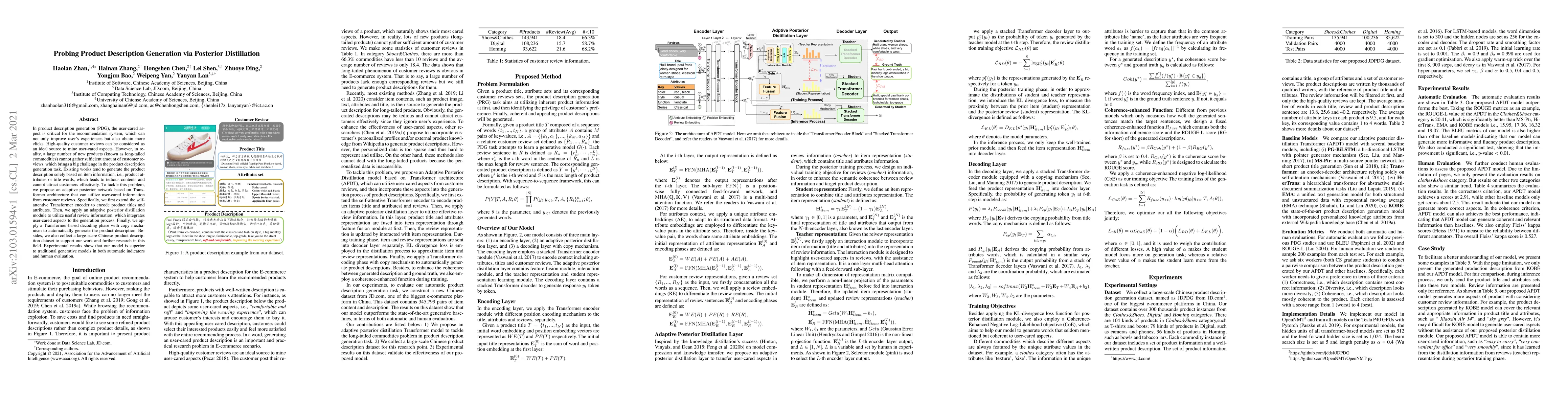 In product description generation (PDG), the user-cared aspect is critical for the recommendation system, which can not only improve user's experiences but also obtain more clicks. High-quality customer reviews can be considered as an ideal source to mine user-cared aspects. However, in reality, a large number of new products (known as long-tailed commodities) cannot gather sufficient amount of customer reviews, which brings a big challenge in the product description generation task. Existing works tend to generate the product description solely based on item information, i.e., product attributes or title words, which leads to tedious contents and cannot attract customers effectively. To tackle this problem, we propose an adaptive posterior network based on Transformer architecture that can utilize user-cared information from customer reviews. Specifically, we first extend the self-attentive Transformer encoder to encode product titles and attributes. Then, we apply an adaptive posterior distillation module to utilize useful review information, which integrates user-cared aspects to the generation process. Finally, we apply a Transformer-based decoding phase with copy mechanism to automatically generate the product description. Besides, we also collect a large-scare Chinese product description dataset to support our work and further research in this field. Experimental results show that our model is superior to traditional generative models in both automatic indicators and human evaluation.