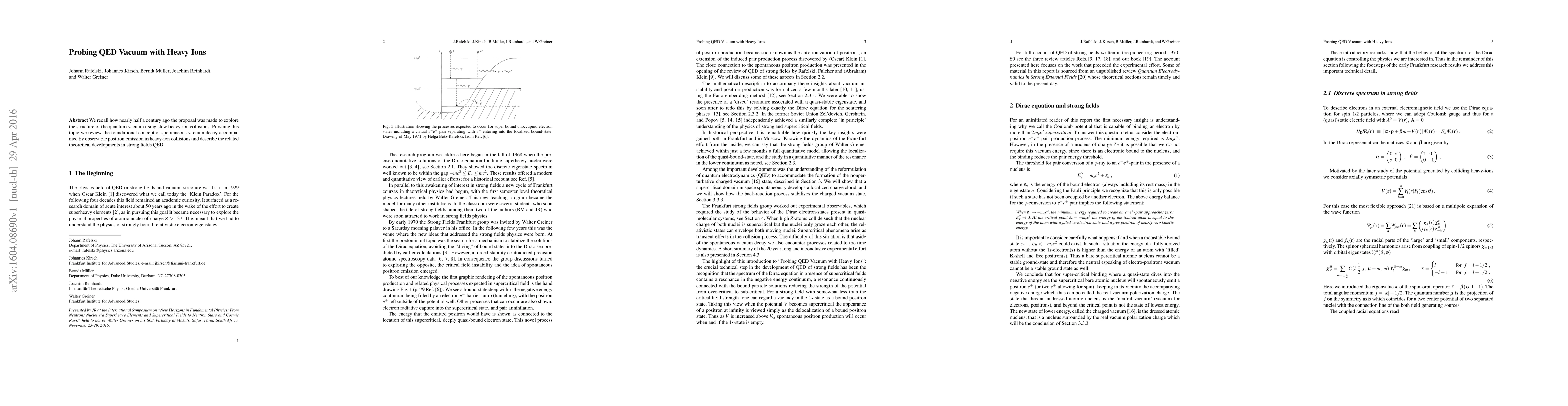 The paper discusses the historical proposal to investigate quantum vacuum structure via slow heavy-ion collisions, highlighting spontaneous vacuum decay and positron emission in heavy-ion collisions. It reviews theoretical advancements in strong fields QED.