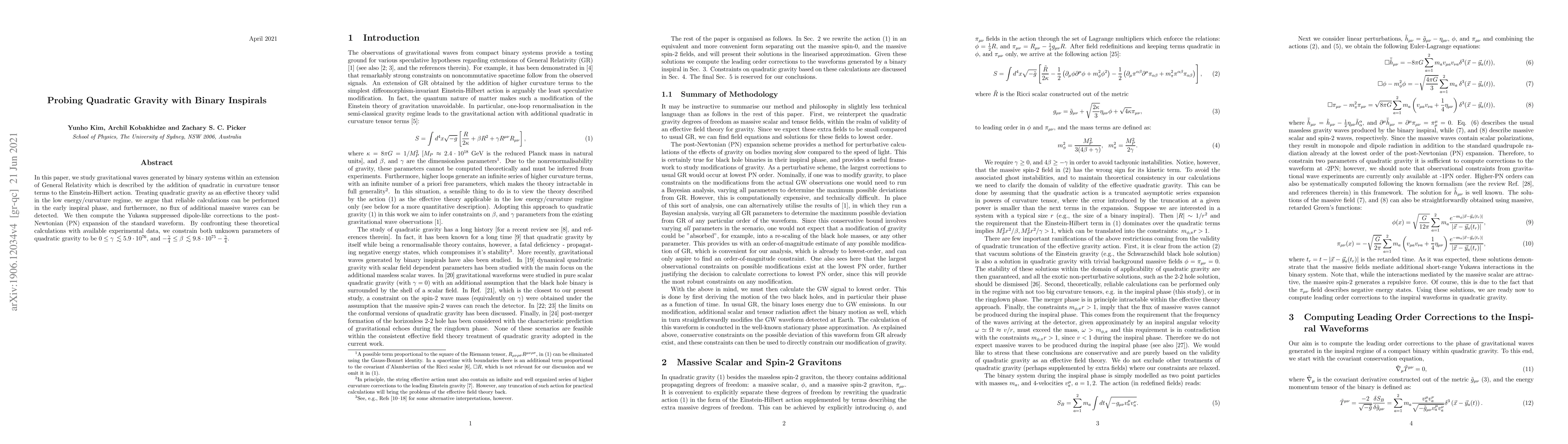 This research paper explores gravitational waves from binary systems in an extended General Relativity model with quadratic curvature terms. By calculating massive dipole corrections to waveforms, the authors constrain unknown quadratic gravity parameters, γ ≼ 5.7×10^76 and β ≼ -4.2×10^75, using experimental data from binary inspirals.