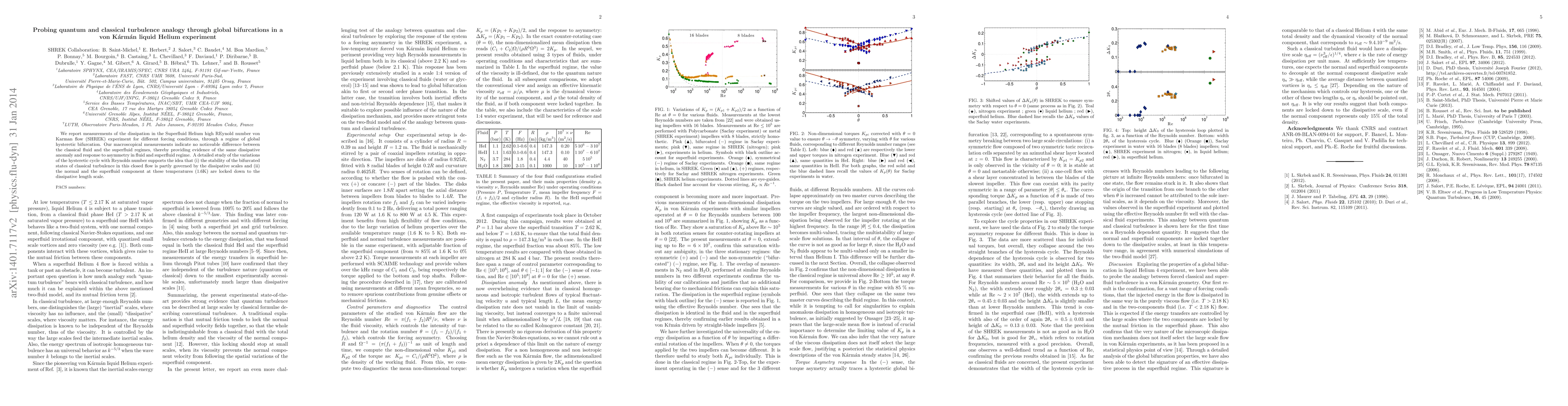 We report measurements of the dissipation in the Superfluid Helium high REynold number von Karman flow (SHREK) experiment for different forcing conditions, through a regime of global hysteretic bifurcation. Our macroscopical measurements indicate no noticeable difference between the classical fluid and the superfluid regimes, thereby providing evidence of the same dissipative anomaly and response to asymmetry in fluid and superfluid regime. %In the latter case, A detailed study of the variations of the hysteretic cycle with Reynolds number supports the idea that (i) the stability of the bifurcated states of classical turbulence in this closed flow is partly governed by the dissipative scales and (ii) the normal and the superfluid component at these temperatures (1.6K) are locked down to the dissipative length scale.