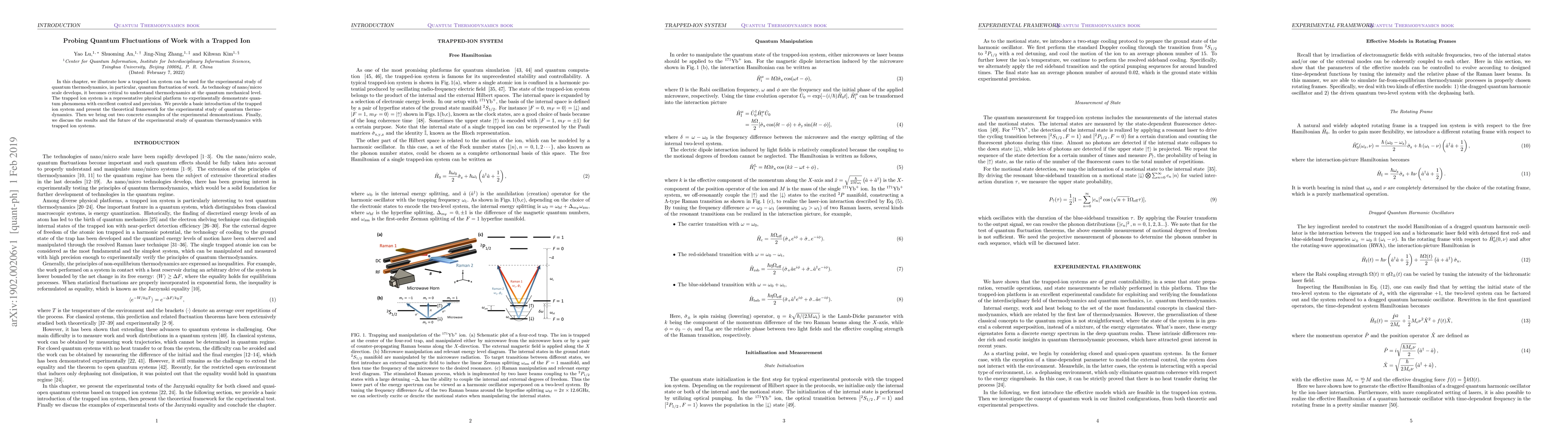 In this chapter, we illustrate how a trapped ion system can be used for the experimental study of quantum thermodynamics, in particular, quantum fluctuation of work. As technology of nano/micro scale develops, it becomes critical to understand thermodynamics at the quantum mechanical level. The trapped ion system is a representative physical platform to experimentally demonstrate quantum phenomena with excellent control and precision. We provide a basic introduction of the trapped ion system and present the theoretical framework for the experimental study of quantum thermodynamics. Then we bring out two concrete examples of the experimental demonstrations. Finally, we discuss the results and the future of the experimental study of quantum thermodynamics with trapped ion systems.