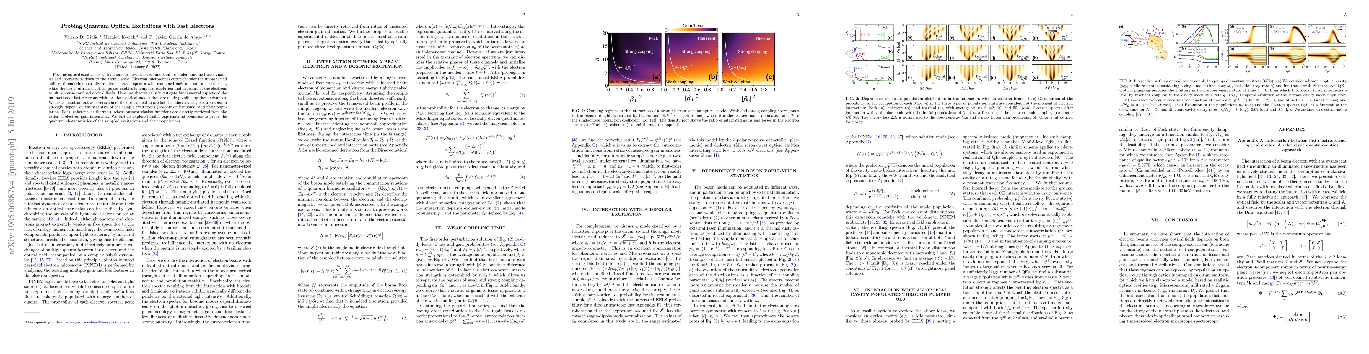 This paper theoretically investigates how fast electrons can probe quantum optical excitations with nanometer resolution, revealing the dynamics of these excitations. It predicts that electron spectra depend on the statistics and population of optical excitations, and suggests experimental methods to explore these quantum characteristics.