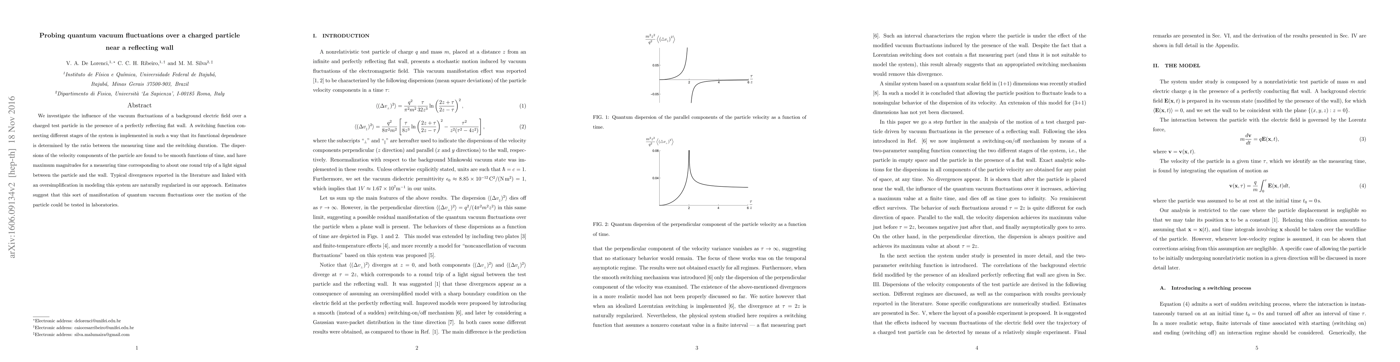 We investigate the influence of the vacuum fluctuations of a background electric field over a charged test particle in the presence of a perfectly reflecting flat wall. A switching function connecting different stages of the system is implemented in such a way that its functional dependence is determined by the ratio between the measuring time and the switching duration. The dispersions of the velocity components of the particle are found to be smooth functions of time, and have maximum magnitudes for a measuring time corresponding to about one round trip of a light signal between the particle and the wall. Typical divergences reported in the literature and linked with an oversimplification in modeling this system are naturally regularized in our approach. Estimates suggest that this sort of manifestation of quantum vacuum fluctuations over the motion of the particle could be tested in laboratories.