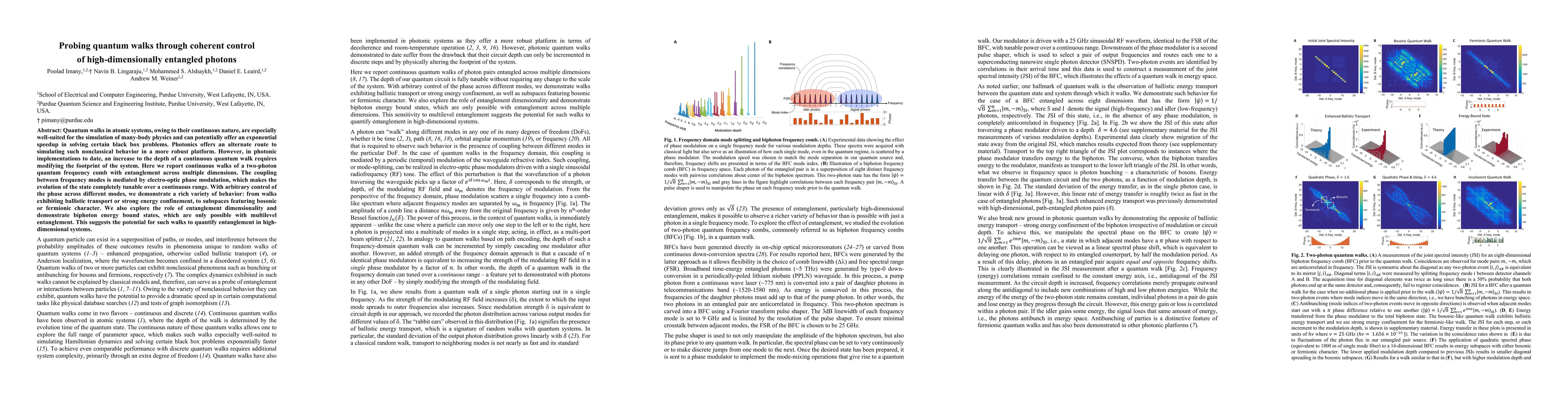 Quantum walks in atomic systems, owing to their continuous nature, are especially well-suited for the simulation of many-body physics and can potentially offer an exponential speedup in solving certain black box problems. Photonics offers an alternate route to simulating such nonclassical behavior in a more robust platform. However, in photonic implementations to date, an increase to the depth of a continuous quantum walk requires modifying the footprint of the system. Here we report continuous walks of a two-photon quantum frequency comb with entanglement across multiple dimensions. The coupling between frequency modes is mediated by electro-optic phase modulation, which makes the evolution of the state completely tunable over a continuous range. With arbitrary control of the phase across different modes, we demonstrate a rich variety of behavior: from walks exhibiting ballistic transport or strong energy confinement, to subspaces featuring bosonic or fermionic character. We also explore the role of entanglement dimensionality and demonstrate biphoton energy bound states, which are only possible with multilevel entanglement. This suggests the potential for such walks to quantify entanglement in high-dimensional systems.