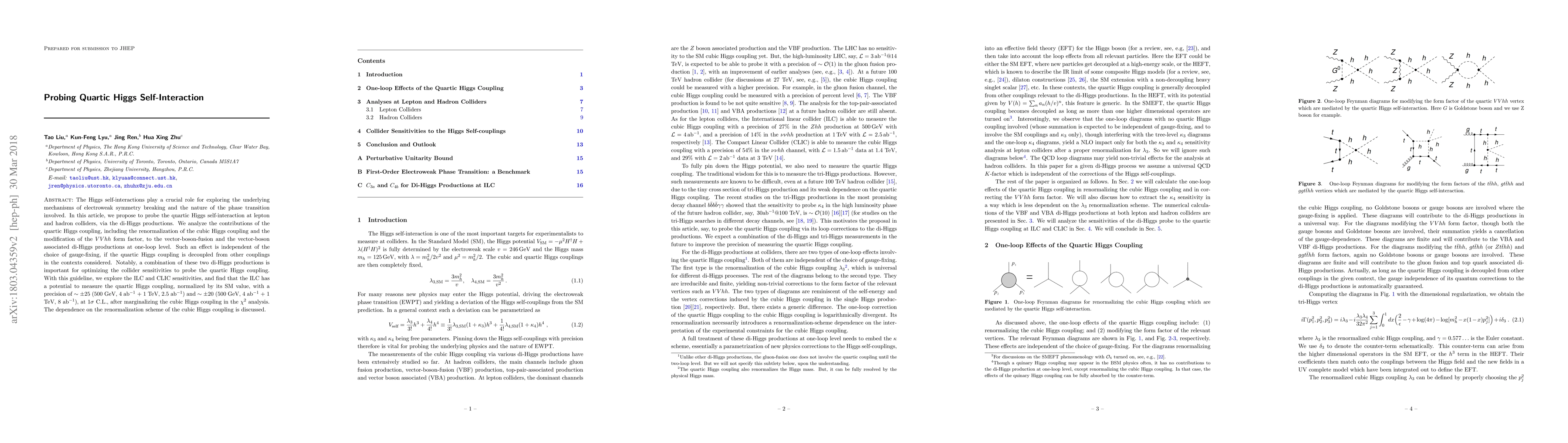 This paper investigates the quartic Higgs self-interaction via di-Higgs production at lepton and hadron colliders, analyzing its impact on vector-boson fusion and associated vector-boson processes at one-loop level. The International Linear Collider (ILC) is shown to have the potential to measure the quartic Higgs coupling with high precision, achieving uncertainties of $\pm 25\%$ at $1\sigma$ C.L.