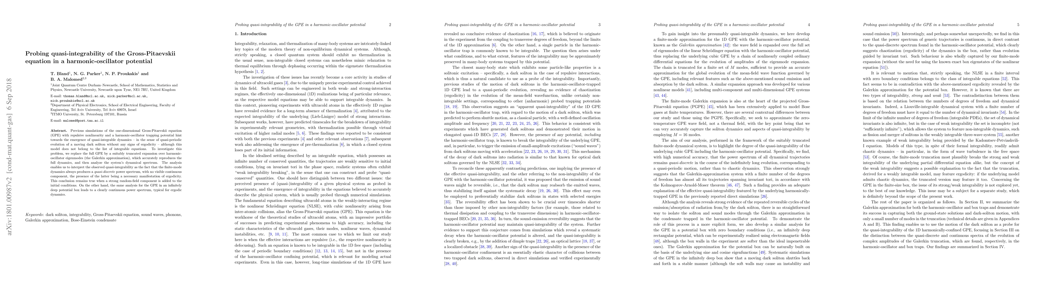 Previous simulations of the one-dimensional Gross-Pitaevskii equation (GPE) with repulsive nonlinearity and a harmonic-oscillator trapping potential hint towards the emergence of quasi-integrable dynamics -- in the sense of quasi-periodic evolution of a moving dark soliton without any signs of ergodicity -- although this model does not belong to the list of integrable equations. To investigate this problem, we replace the full GPE by a suitably truncated expansion over harmonic-oscillator eigenmodes (the Galerkin approximation), which accurately reproduces the full dynamics, and then analyze the system's dynamical spectrum. The analysis enables us to interpret the observed quasi-integrability as the fact that the finite-mode dynamics always produces a quasi-discrete power spectrum, with no visible continuous component, the presence of the latter being a necessary manifestation of ergodicity. This conclusion remains true when a strong random-field component is added to the initial conditions. On the other hand, the same analysis for the GPE in an infinitely deep potential box leads to a clearly continuous power spectrum, typical for ergodic dynamics.