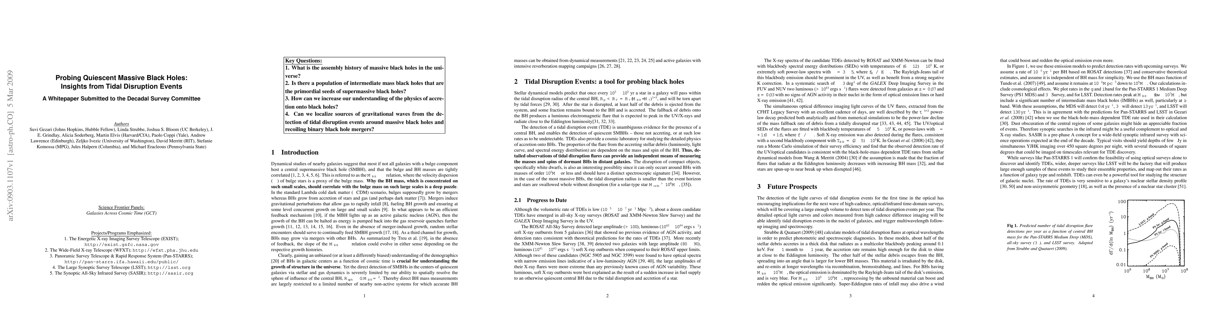 This paper explores tidal disruption events (TDEs) as a method to study quiescent massive black holes, aiming to address four key questions: the assembly history of black holes, the existence of intermediate mass black holes, the physics of accretion, and the potential to localize gravitational wave sources from TDEs and binary black hole mergers.
