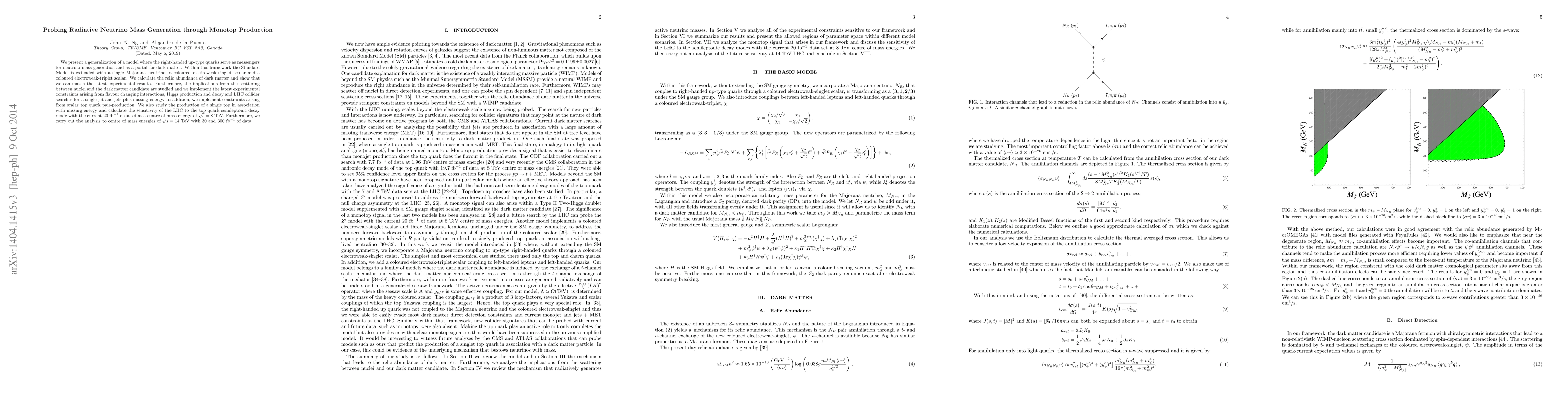We present a generalization of a model where the right-handed up-type quarks serve as messengers for neutrino mass generation and as a portal for dark matter. Within this framework the Standard Model is extended with a single Majorana neutrino, a coloured electroweak-singlet scalar and a coloured electroweak-triplet scalar. We calculate the relic abundance of dark matter and show that we can match the latest experimental results. Furthermore, the implications from the scattering between nuclei and the dark matter candidate are studied and we implement the latest experimental constraints arising from flavour changing interactions, Higgs production and decay and LHC collider searches for a single jet and jets plus missing energy. In addition, we implement constraints arising from scalar top quark pair-production. We also study the production of a single top in association with missing energy and calculate the sensitivity of the LHC to the top quark semileptonic decay mode with the current $20$ fb$^{-1}$ data set at a centre of mass energy of $\sqrt{s}=8$ TeV. Furthermore, we carry out the analysis to centre of mass energies of $\sqrt{s}=14$ TeV with $30$ and $300$ fb$^{-1}$ of data.