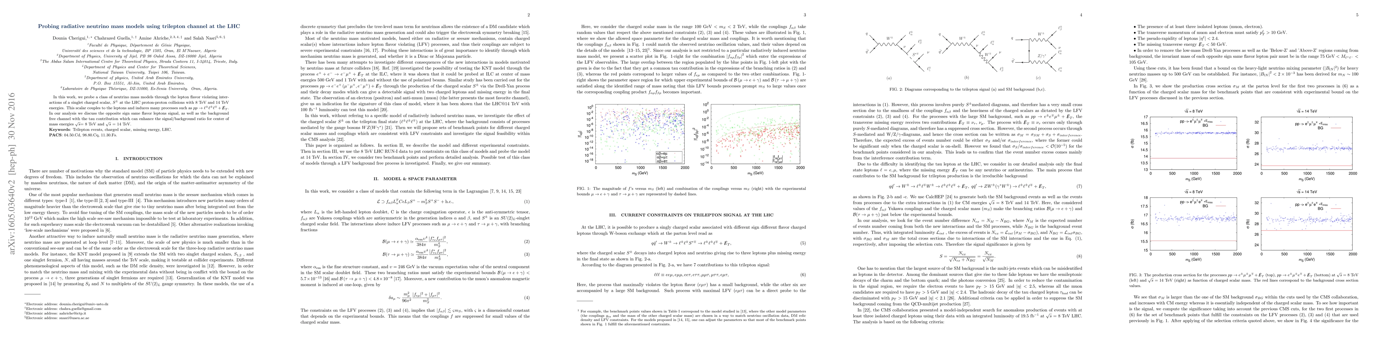 This paper investigates neutrino mass models using the trilepton channel at the LHC, focusing on the lepton flavor violating interactions of a singlet charged scalar $S^{\pm}$. It analyzes the signal $pp\rightarrow\ell^{\pm}\ell^{\pm}\ell^{\mp}+\slashed{E}_{T}$ at 8 TeV and 14 TeV, highlighting the tau contribution to improve the signal/background ratio.